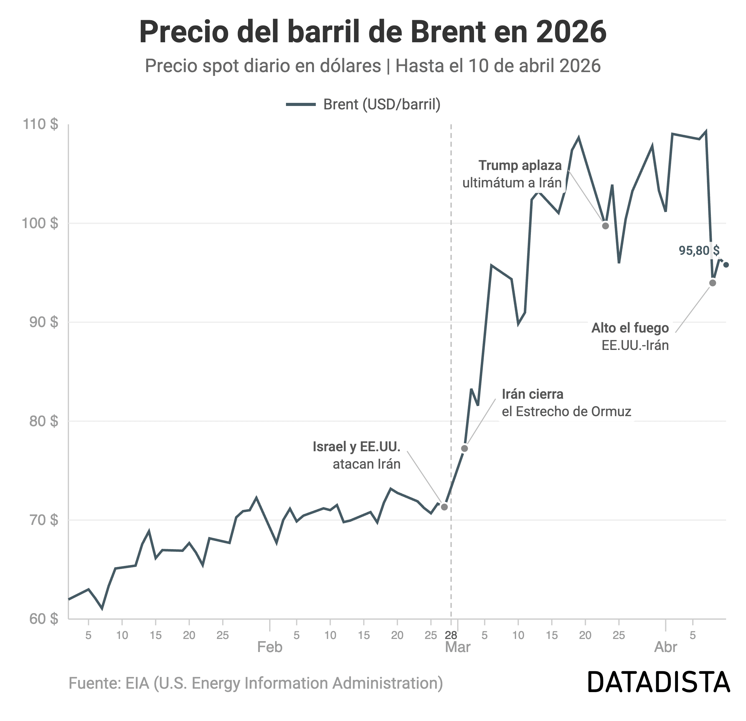 El barril de Brent se desplomó 15 dólares el miércoles tras el anuncio de acuerdo de alto el fuego entre EEUU e Irán, de 109 a 94 dólares en una sola sesión. A cierre de semana cotizaba en torno a 96 dólares: lejos del pico, pero aún 25 dólares por encima de los niveles previos a la crisis de Irán.