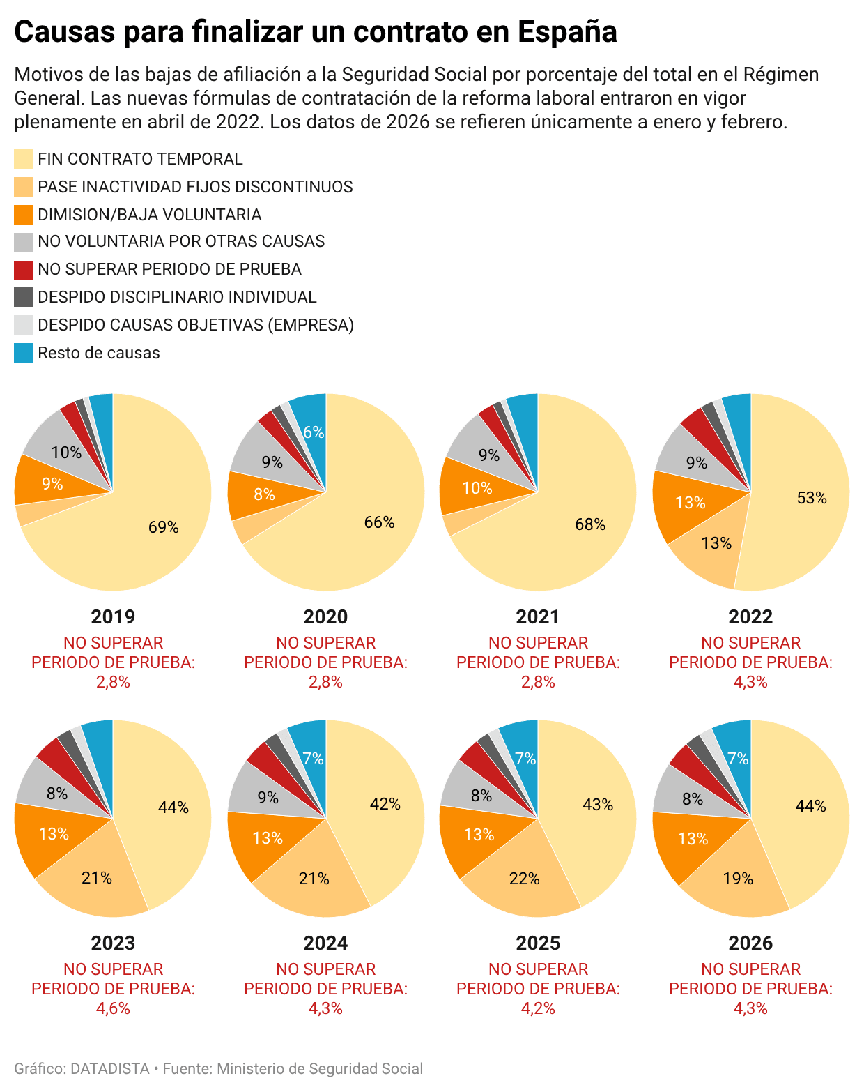 Si se suman las bajas de enero y febrero de 2026, últimos datos disponibles, algo más de 7.000 contratos causaron baja por no superar el periodo de prueba (4,3% del total de bajas). En todo el año 2025, fueron 48.830 las bajas que se tramitaron en la Seguridad Social alegando que el trabajador o trabajadora no había superado ese periodo durante el que el empleador(a) está aún liberado de buena parte de las obligaciones de los contratos indefinidos. Tanto en 2019 como en 2021, por poner el año previo a la reforma pero también un ejercicio que no estuviese afectado por la pandemia de la COVID-19, las bajas en periodo de prueba representaban el 2,8% del total de bajas. En 2022, ya escaló al 4,3%.