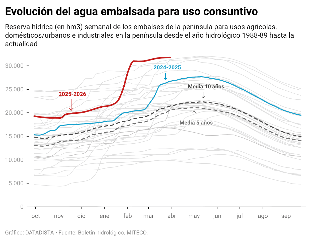 En la última semana, el agua disponible ha subido 38 hm³, la entrada más contenida dentro de una racha de ocho récords consecutivos. Este volumen se sitúa 30,3 puntos por encima de la media de los últimos cinco años y 13,1 puntos por encima de la misma semana de 2025.
