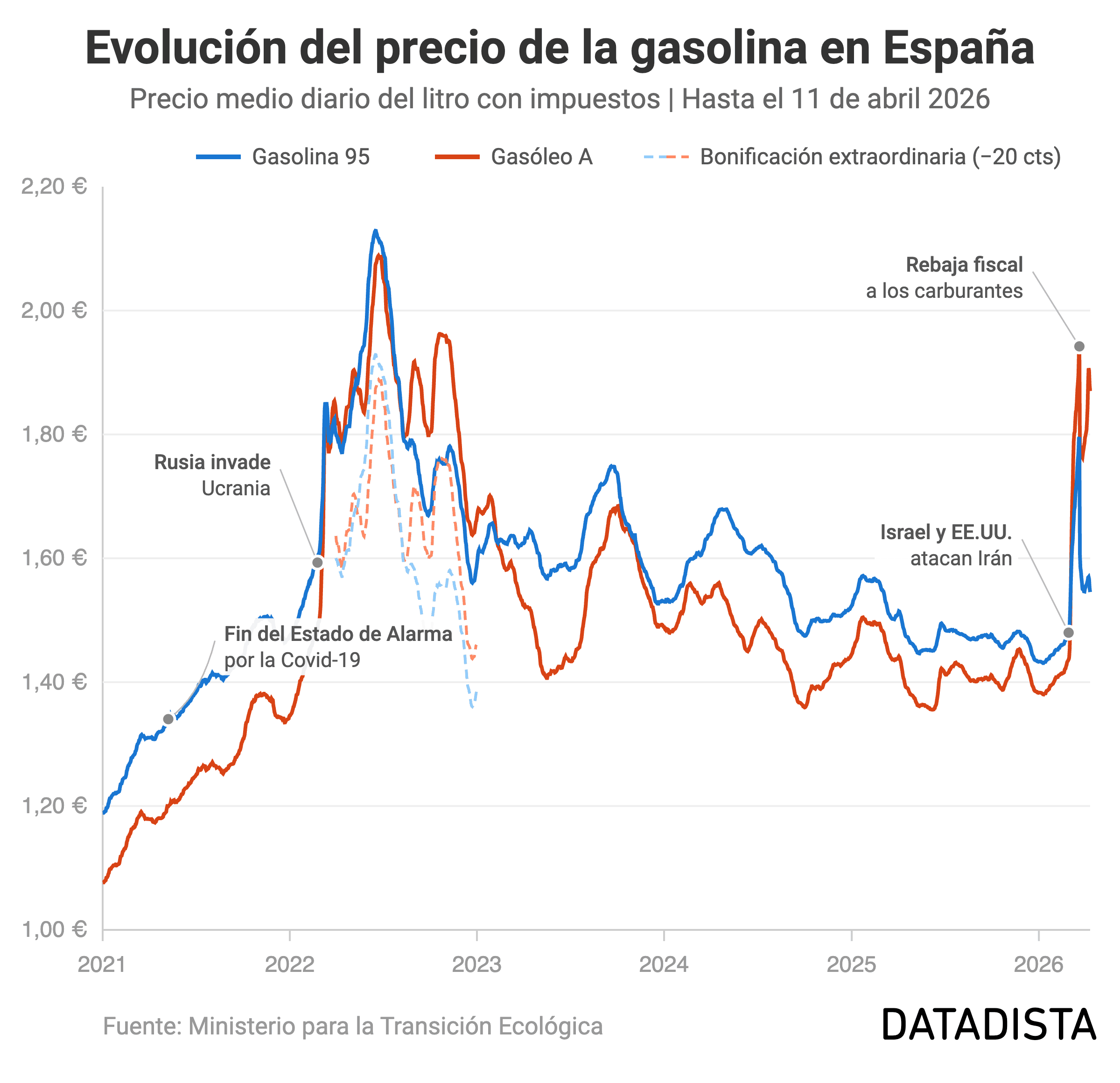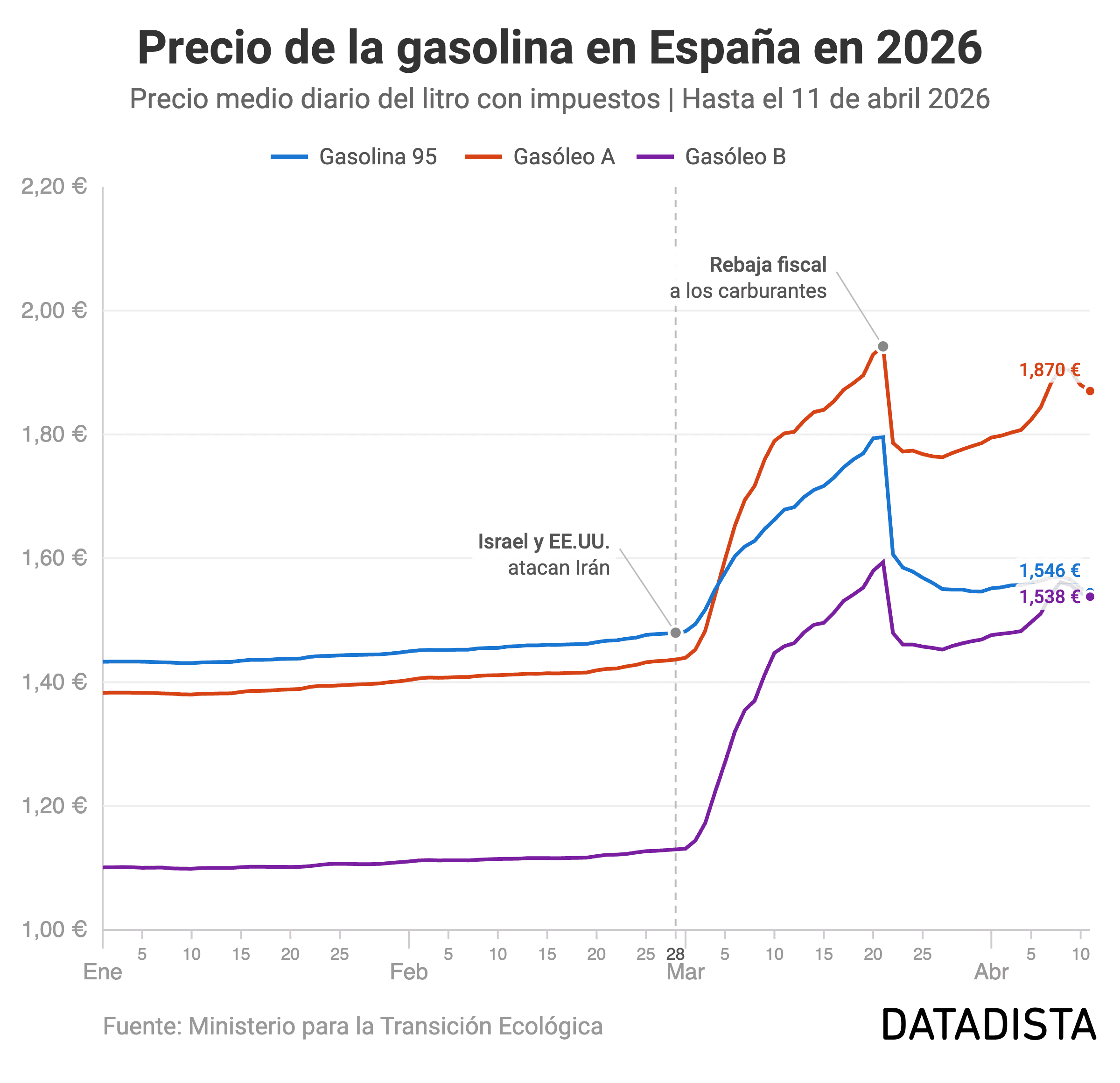 A pesar de ese descenso, la factura respecto a antes de la guerra sigue abultada. La gasolina cuesta 7 céntimos más por litro que el 28 de febrero, unos 3 euros en un depósito de 50 litros. El diésel, 43 céntimos más: casi 22 euros de diferencia por depósito. Comparado con abril del año pasado, la gasolina apenas varía (+6 céntimos), pero el diésel es 46 céntimos más caro: 23 euros más por cada llenado.