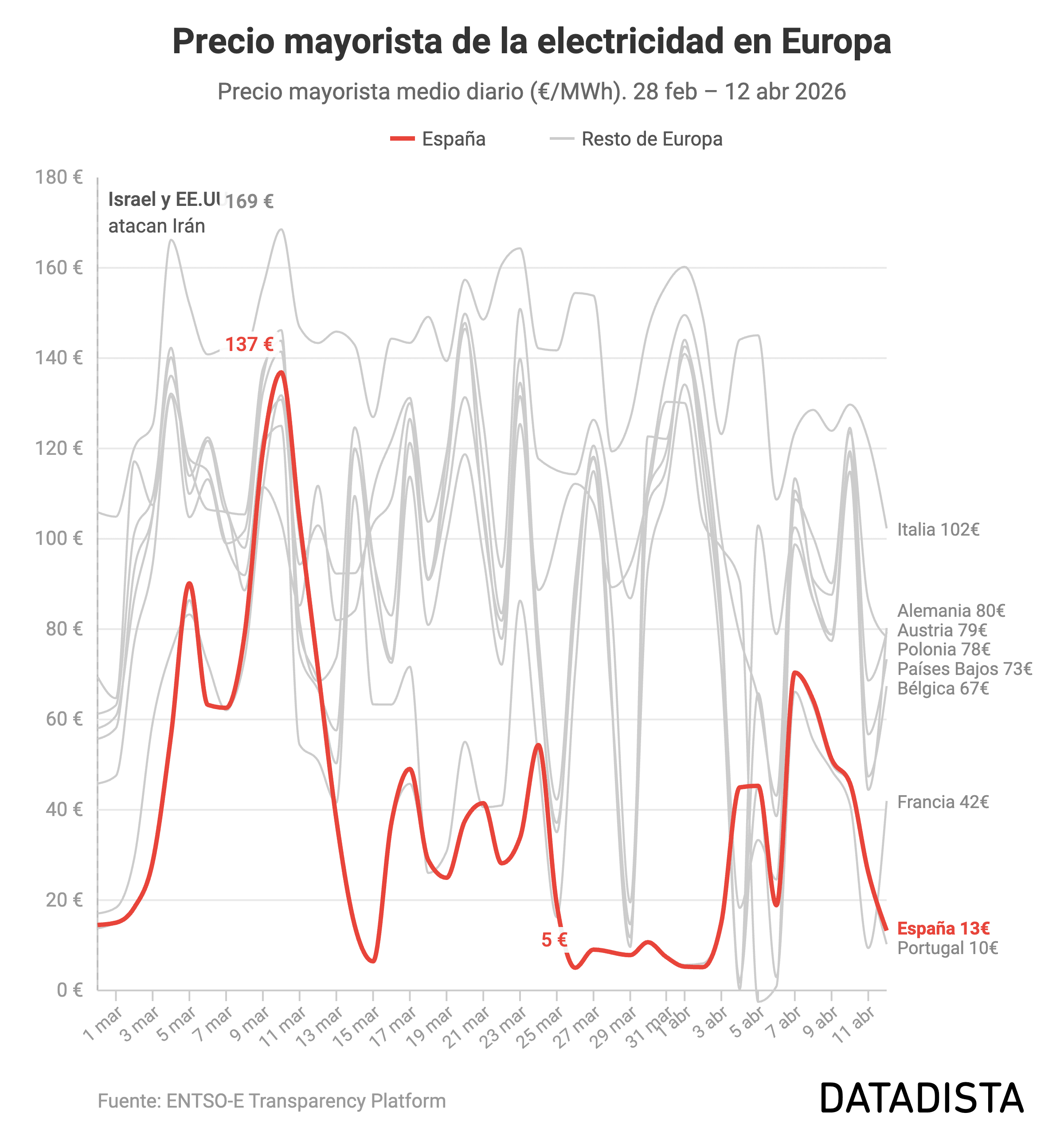 Este fin de semana, cuando la eólica volvió con fuerza, cubrió más de un tercio de la generación y el precio español ha caído de nuevo a 13 euros. Italia sigue siendo la más cara de Europa, a casi el triple que España.