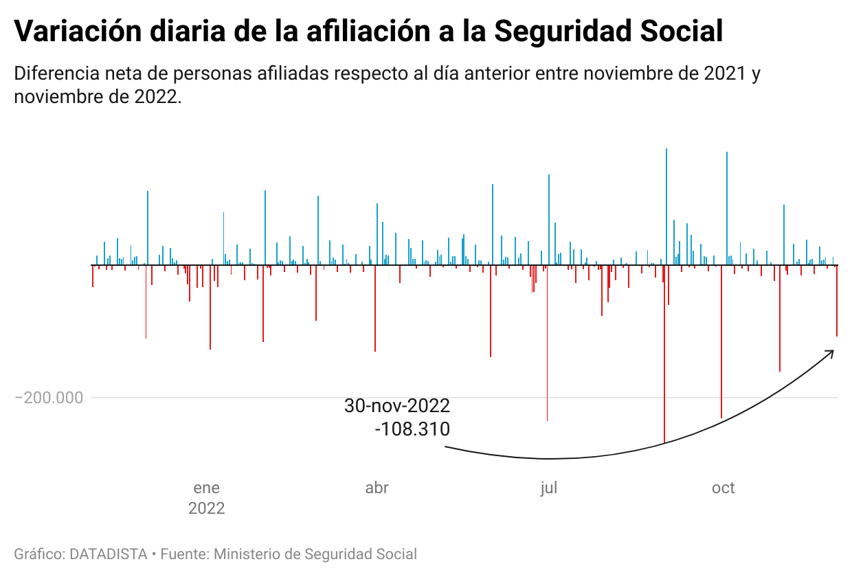 Un mes mas, asistimos a las caídas de afiliación neta de los viernes, subidas los lunes y desplome el último día laboral del mes. Y noviembre de 2022, con la reforma laboral plenamente en vigor, con el contrato de obra y servicio desaparecido y los temporales limitados a circunstancias muy concretas, la máquina burocrática de altas y bajas sigue en marcha.