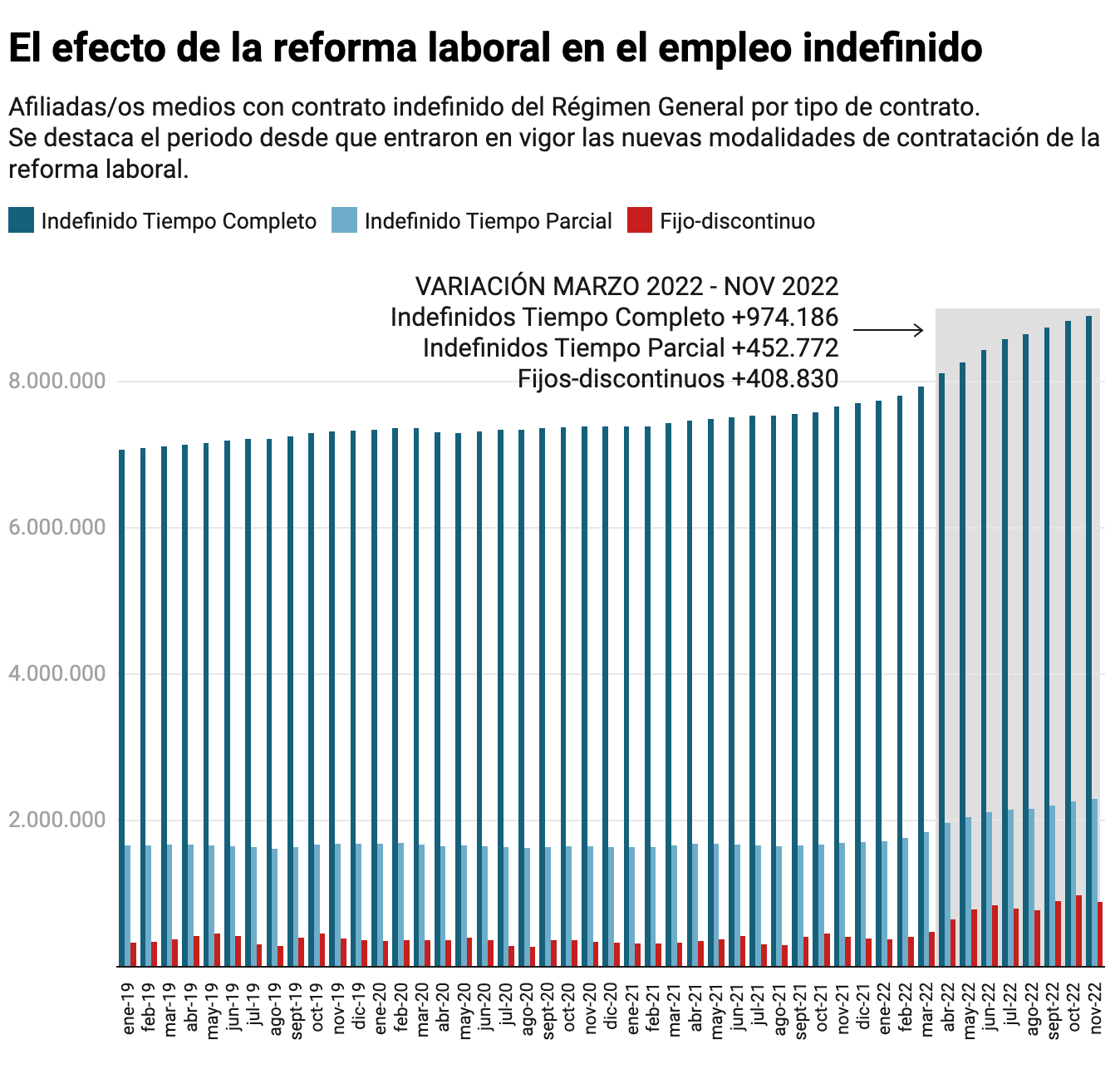 La reforma laboral pretendía fomentar la contratación indefinida y es difícil negar el éxito que ha tenido en ese sentido. Porque no es en los fijos-discontinuos donde más se ha incrementado el número de personas que tienen, según los datos de noviembre, un contrato indefinido, ni siquiera los indefinidos con contrato a tiempo parcial (+452.772). Si hay una categoría que ha crecido desde marzo de 2022 (último mes con el esquema de contratación de la normativa laboral anterior a la reforma) son los indefinidos que se consideran de mayor calidad, aquellos con contrato a tiempo completo, que ya se acercan a un incremento de un millón en los seis meses que han pasado desde la entrada en vigor plena de la reforma laboral.