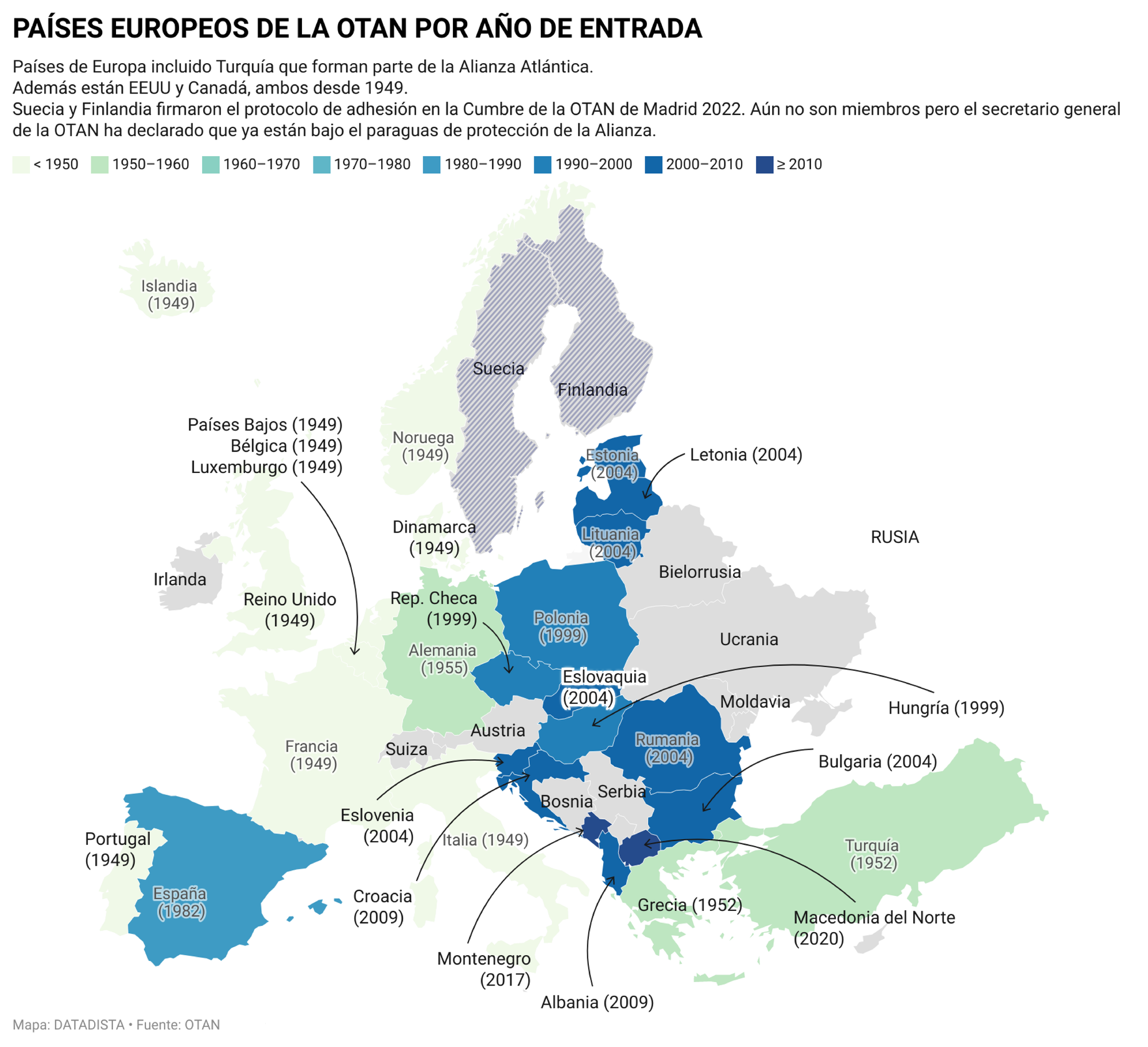 No es la primera vez que compartimos este mapa contigo aunque lo hemos actualizado. Muestra los países de Europa que pertenecen al club Atlántico junto a su año de entrada, pero además hemos añadido Finlandia y Suecia, que aún no forman parte de la OTAN. ¿Por qué?