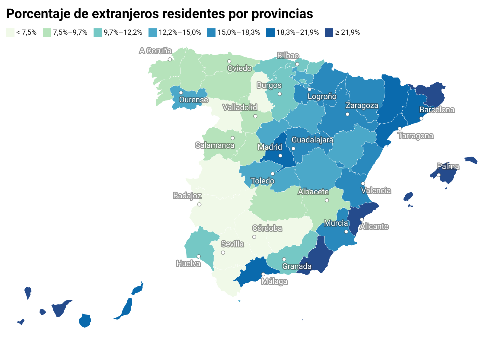 Esto lo vas a ver más claro en el siguiente mapa, donde mostramos el porcentaje de personas nacidas en el extranjero residentes por provincias. En Baleares (24,72%), Alicante (23,45%) y Girona (23,23%) son las provincias con mayor porcentajes de extranjeros residentes. Le siguen Melilla, Santa Cruz de Tenerife, Almería, Madrid, Málaga y Lleida.