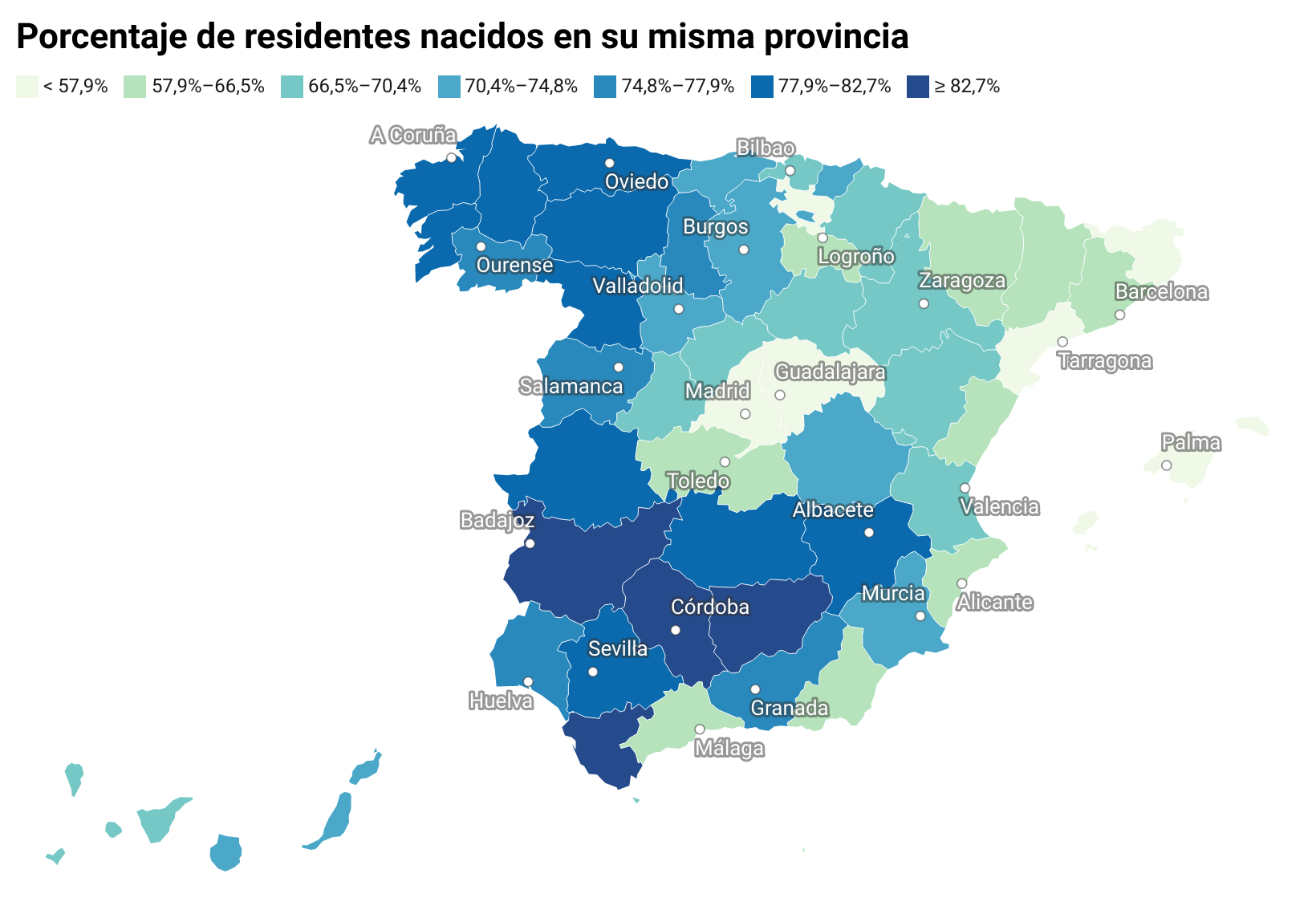 En el siguiente mapa puedes ver las provincias donde viven más residentes nacidos en su misma provincia. En las provincias de Jaén, Córdoba, Badajoz, Cádiz, Sevilla, Ciudad Real y Cáceres, más del 80% de la población residente ha nacido en su misma provincia.