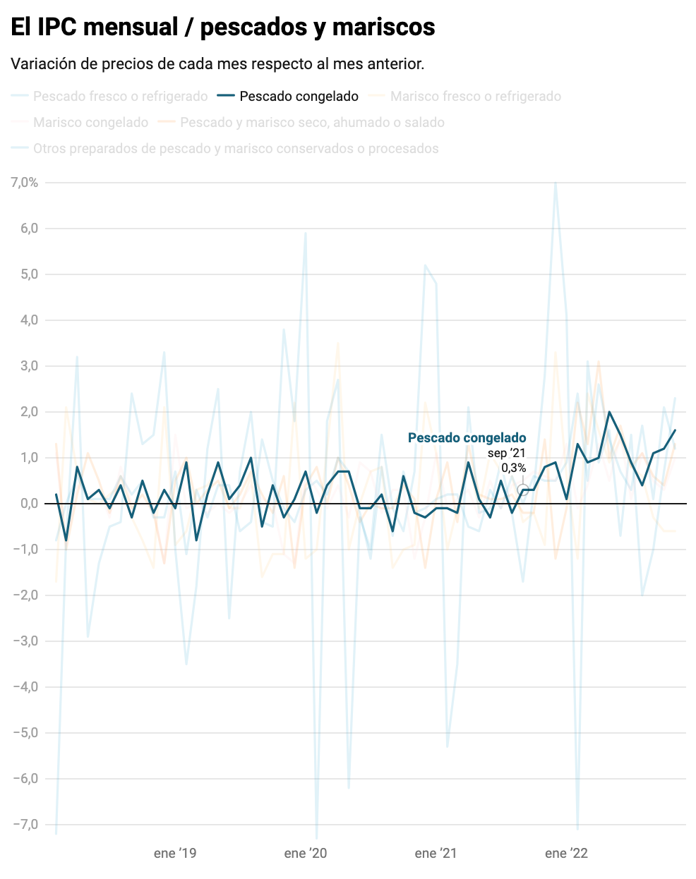Si nos fijamos en el pescado congelado, de nuevo habitual sustituto del pescado fresco para los bolsillos más modestos, vemos que su comportamiento habitual a lo largo de cada año, mucho más estable, con subidas y bajadas mensuales no superiores al 1%, también se ve modificado desde hace más de un año. Empezaron a acumularse las subidas mensuales desde septiembre de 2021 (+0,3%) a las que se sumó octubre (otro +0,3%); noviembre (+0,8%); diciembre (+0,9%) y enero de 2022 (+0,1%). Desde entonces las subidas consecutivas mensuales no solo se han mantenido sino que han sido más potentes aún desde el momento en que estalla la guerra (+1,3%, +0,9%, +1%, +2%, +1,5%, +0,9%,+0,4%, +1,1%, +1,2%, +1,6%).