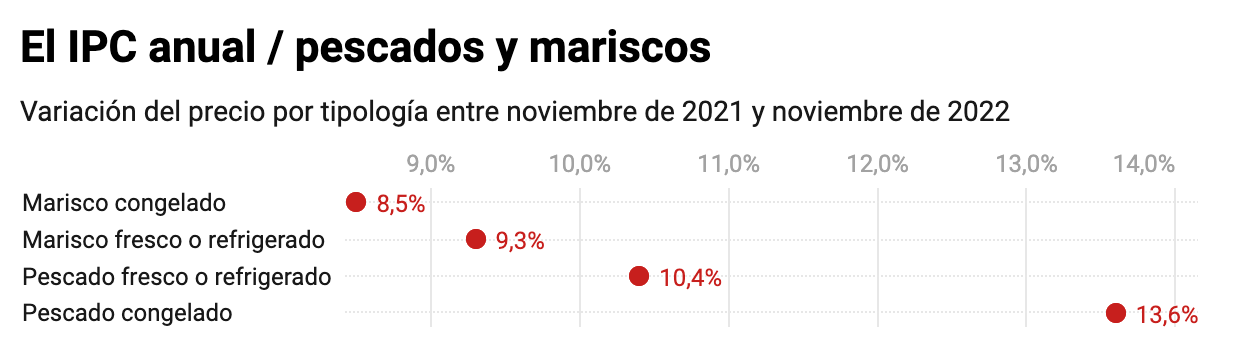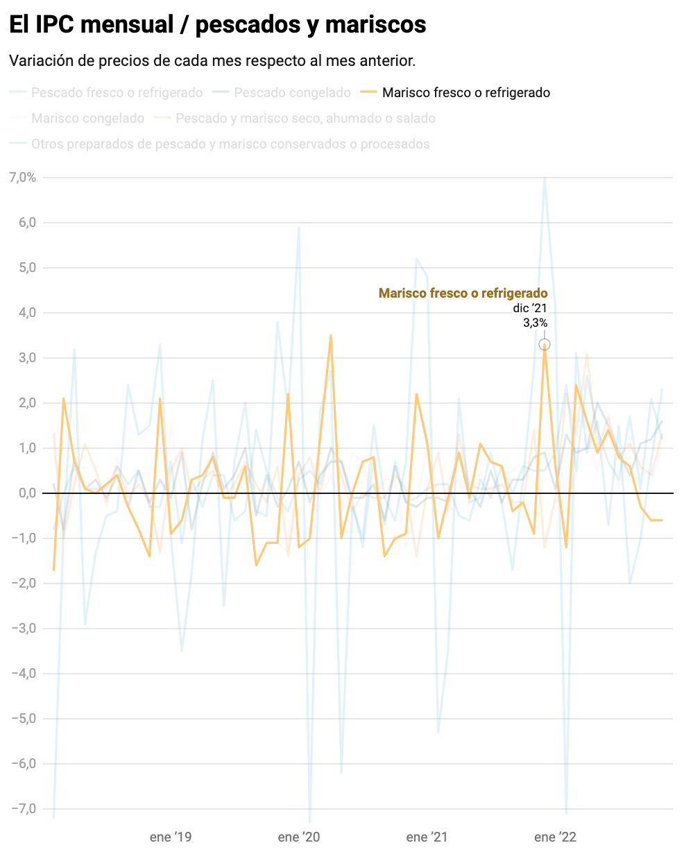 ¿Qué ha ocurrido con pescados y mariscos, otra de las estrellas de las fiestas de cierre de ejercicio? El pescado fresco o refrigerado, que tiene un comportamiento bastante volátil como puedes ver pero acostumbra a subir con fuerza a final de año, ya pegó un buen estirón a finales de 2021 (+2,8% de octubre a noviembre y +7% de noviembre de diciembre) al que se sumó una nueva subida en enero de 2022 (+4,1%). La bajada de febrero (-7,1%) no compensó todas esas subidas pero es cierto que en este caso en el cómputo general (otra cosa es si se mira por tipos de pescado) esta partida del IPC ha tenido meses de bajada de precios en el último año.