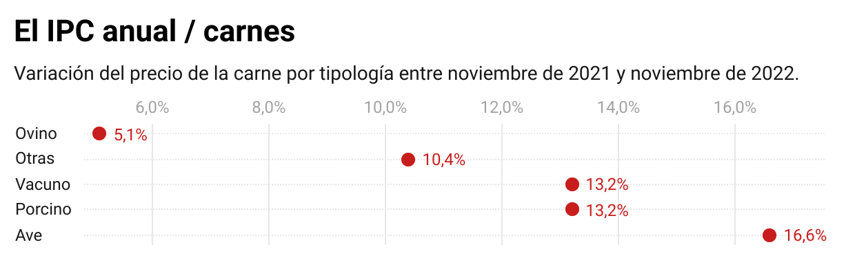 Y llegamos a las navidades de 2022. Para conocer el acumulado de esas subidas mes a mes en cada tipología de carne ahora sí hemos cogido el IPC anual, entre noviembre de 2021 y noviembre de 2022 y este es el resultado. La carne de ovino es en realidad la que menos sube en la comparativa interanual. La de vacuno y porcino acumula ya subidas del 13,2% y la de ave, del 16,6%.