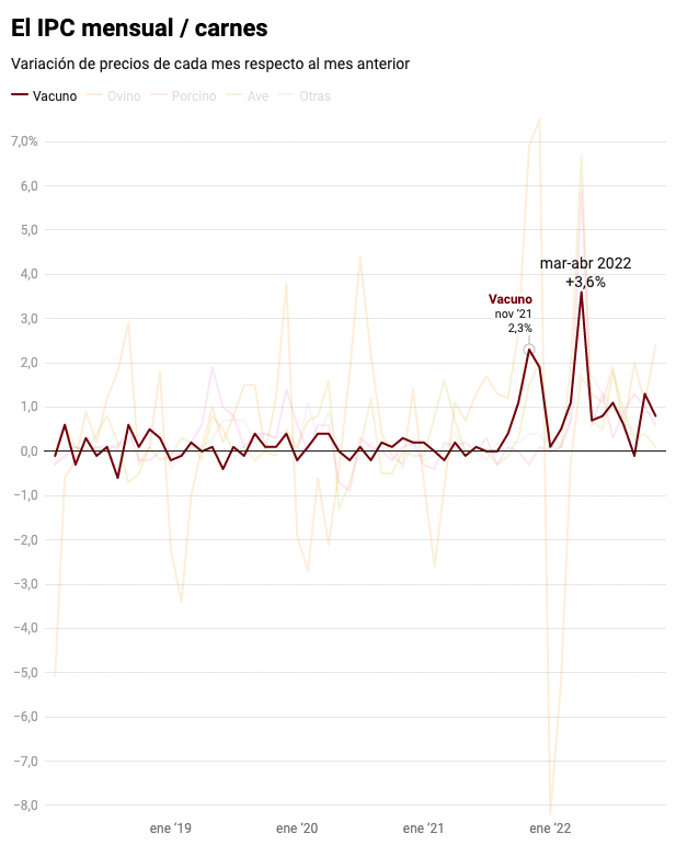 Si nos fijamos en la carne de vacuno, cuyo comportamiento solía ser muchísimo más estable que la de ovino, las subidas que empezaron en septiembre de 2021 (+0,4%) no nos han abandonado prácticamente ningún mes. A aquella subida se le añadió otro 2,3% en noviembre; el 1,9% más en diciembre; y después subidas más leves pero siempre al alza que se disparan entre marzo y abril de 2022, inicio de la guerra en Ucrania, cuando la subida que se añadió fue del 3,6%. Y desde entonces de nuevo todo subidas acumuladas salvo septiembre, que más que bajar, el precio se mantuvo prácticamente plano (-0,1%).