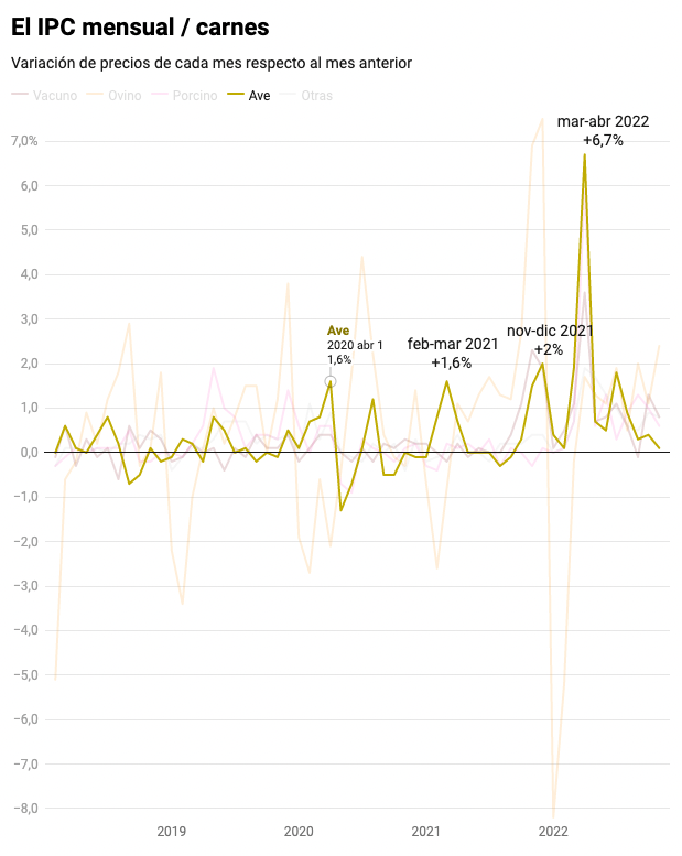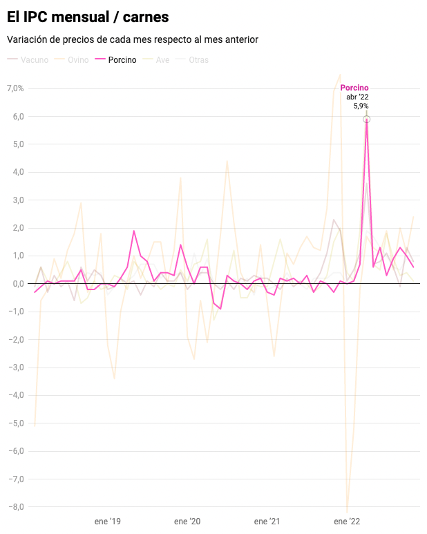 ¿Qué ha ocurrido con las carnes en principio más económicas como el porcino y la carne de ave? En la comparativa intermensual, ambas fueron las que más se dispararon cuando se inició la invasión de Ucrania por Rusia (porcino +5,9% y ave +6,7% entre marzo y abril de 2022), complicando la vida especialmente a los bolsillos más modestos, que suelen consumir mayoritariamente este tipo de carnes. Te recordamos este reportaje que hicimos para eldiario.es este año en el que viajábamos por la Ruta por la España de los pensionistas pobres en tiempos de inflación desbocada, donde nos repetían frases como "la ternera, ni tocarla".