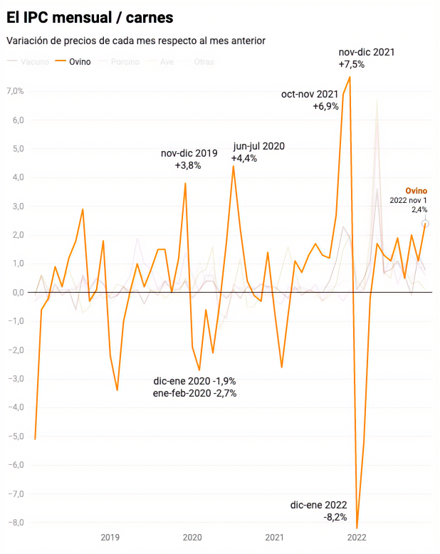 Lo que ocurrió en el otoño de 2021, cuando empezó la escalada de precios, fue que se acumularon subidas mes tras mes bastante por encima de las de ejercicios anteriores. Entre octubre y noviembre de 2021, la carne de ovino subió un 6,9% y a esa subida se le añadió al mes siguiente, entre noviembre y diciembre, otro 7,5%. La bajada de enero (-8,2%), aunque pronunciada, no compensó el incremento de los meses previos. Y llegó la guerra de Ucrania. La carne de ovino ha experimentado durante todo el año meses continuados de subidas del precio que no ha vuelto a bajar (en el gráfico, no se ha vuelto a situar por debajo de la línea del 0%).