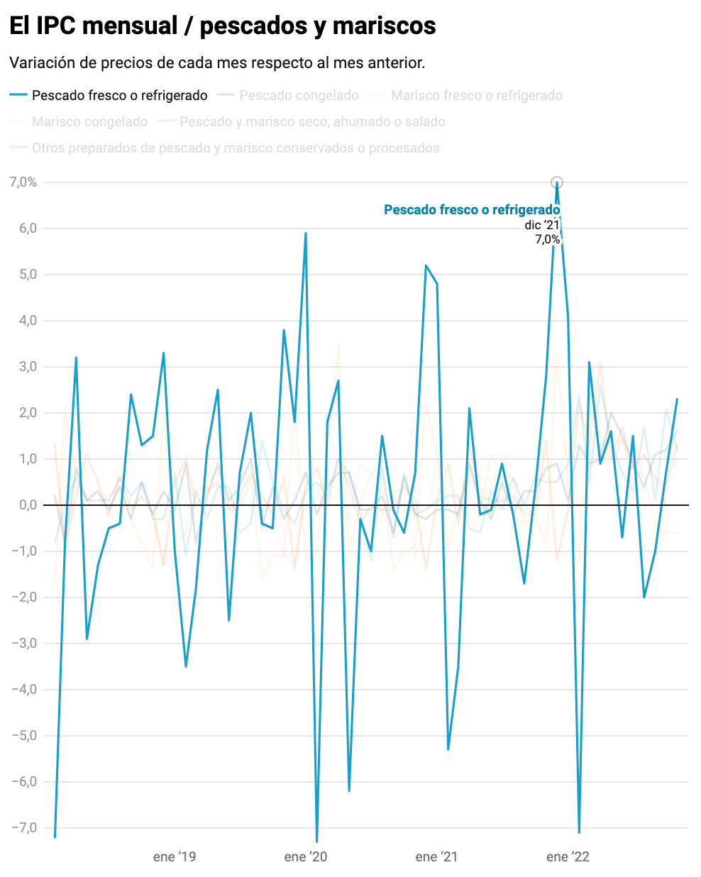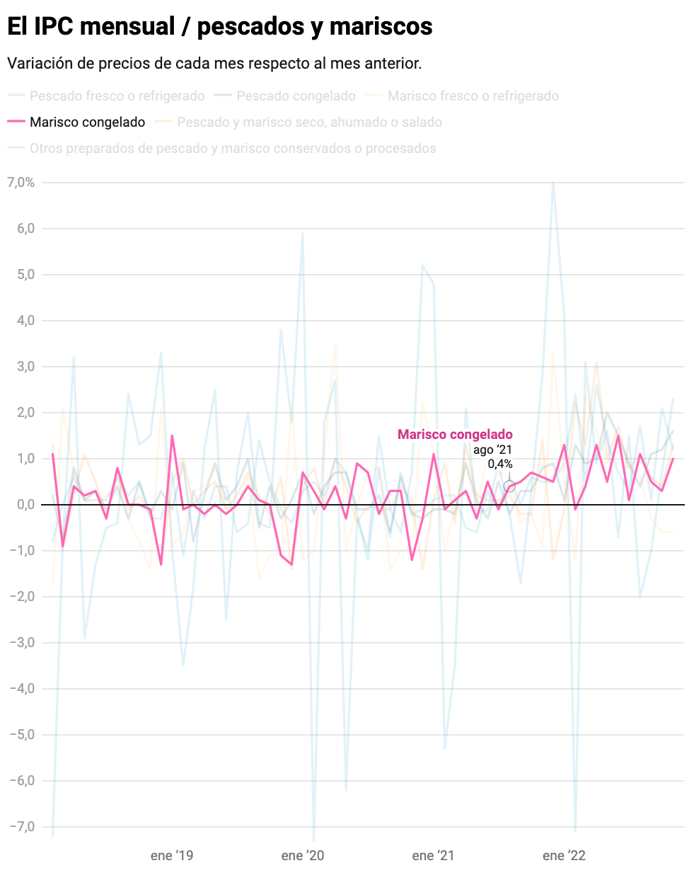 En marisco fresco, de nuevo la volatilidad estacional compensada al menos en parte por momentos de bajada, a pesar de mantener subidas desde el estallido de la guerra hasta agosto de este año.