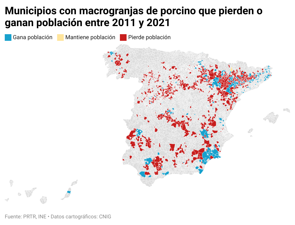 Están ubicadas en 1.260 municipios de todo el país, especialmente en Aragón, Cataluña y la Región de Murcia. La mayoría de estos municipios (el 84%) tiene menos de 5.000 habitantes y el 80% ha experimentado una disminución en su población en los últimos 10 años. La sangría se ceba especialmente con las zonas altamente despobladas, como la Serranía Celtibérica conformada por 169 municipios de 10 provincias. En una extensión de más de 65.000 km2 viven 98.035 personas junto con 330 macrogranjas de porcino con millones de animales a lo largo del año. El 94% de estos municipios ha perdido población en la última década.