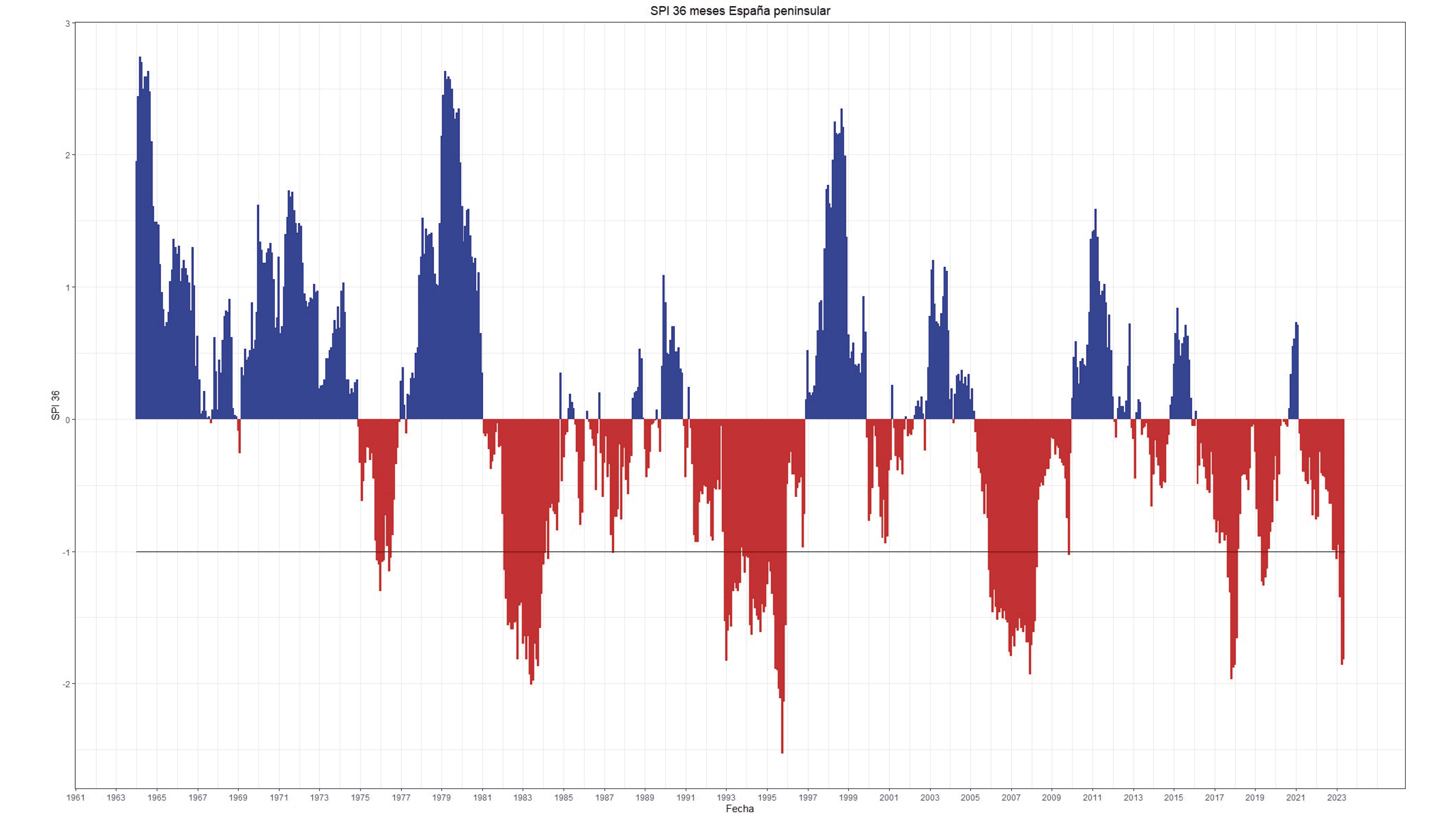 En la España peninsular nos encontramos en una situación de sequía de larga duración desde finales de 2022. En este gráfico puedes ver el Índice de Precipitación Estandarizada (SPI) a 36 meses desde 1961 hasta mayo de 2023. Cuando el SPI está en -1 o menos, indica que la región está experimentando una situación de sequía. Una vez que una región muestra un SPI de -1, no se considera que sale de esta situación hasta que el SPI vuelve a valores positivos.