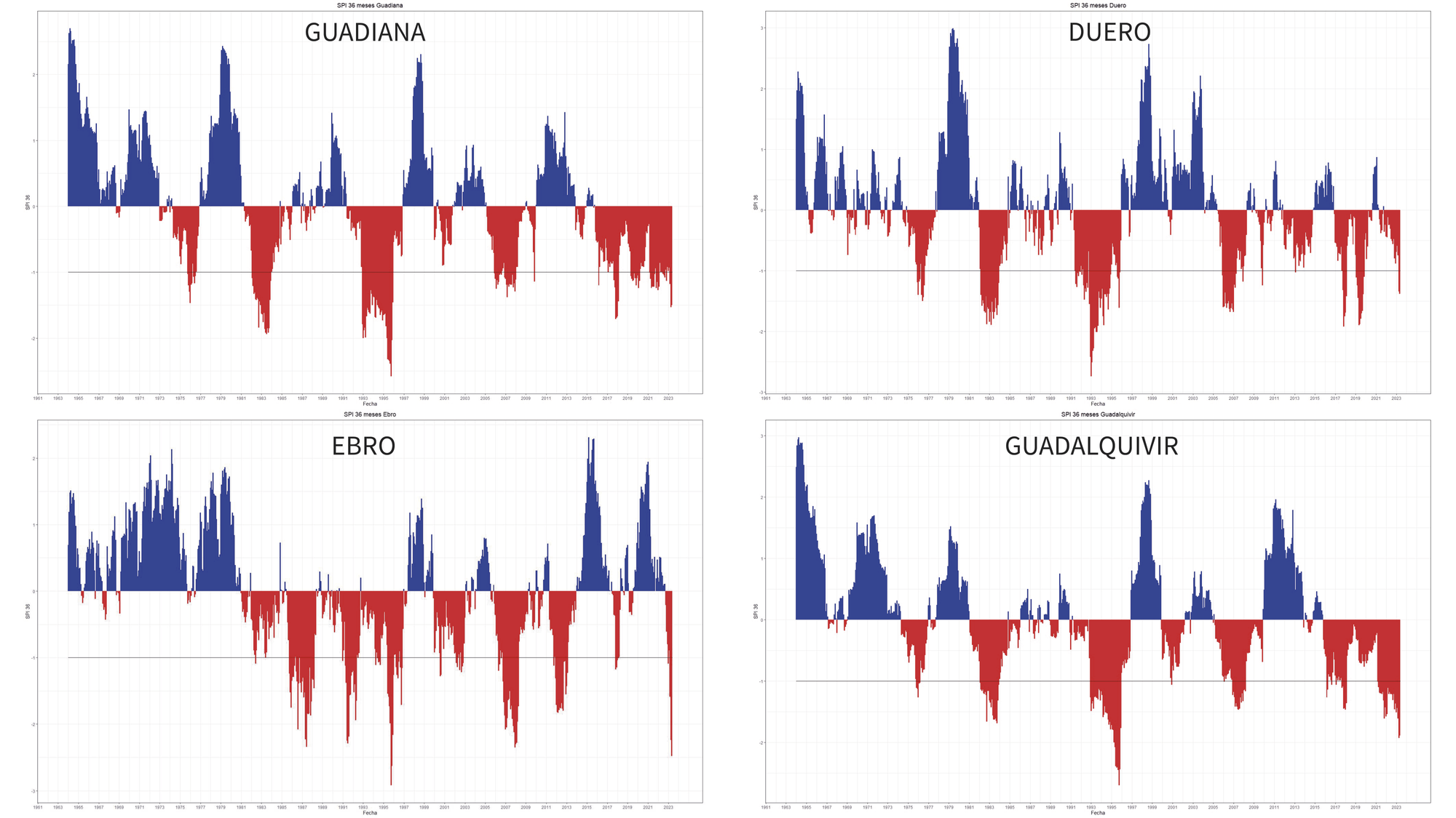 En el siguiente gráfico te mostramos el SPI a 36 meses en cuatro de las principales cuencas hidrográficas del país: Guadiana, Duero, Ebro y Guadalquivir, donde el SPI está por debajo de -1.