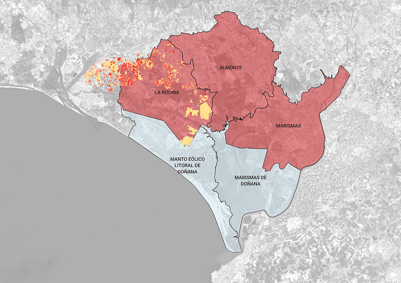 Es más, la Junta se refiere una y otra vez a riegos "con derecho acreditado", cosa que no tienen los cultivos cuyo suelo ahora mismo ni siquiera es regable . Que la Junta los haga regables tampoco les va a otorgar derechos de agua porque eso lo hace la Confederación Hidrográfica y al estar declarados como sobreexplotados no puede dar concesiones nuevas. La Junta en sus alegaciones habla, por ejemplo, de los volúmenes asignados para "riegos con derecho acreditado que están actualmente tomando el agua del acuífero Almonte Marismas (Doñana)". Se queja de cantidades que han desaparecido en la versión final. También alude a "regadíos existentes con derecho acreditado" cuando habla del trasvase de agua desde la cuenca del Tinto, Odiel y Piedras aprobado en 2018 y destinado a sustituir agua subterránea por superficial para aliviar la sobreexplotación del acuífero de Doñana.