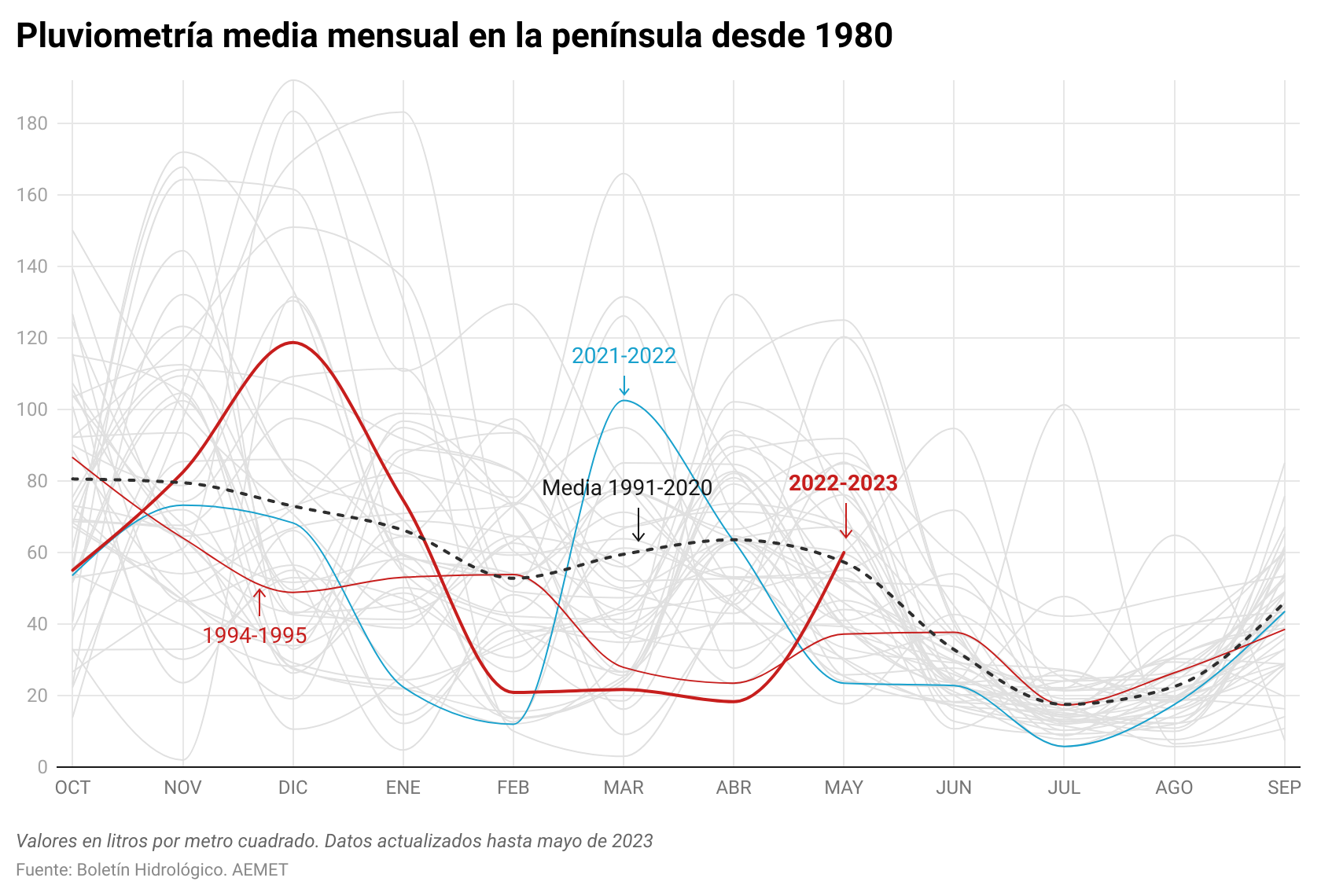 Los meses de marzo y abril fueron extremadamente cálidos, con una temperatura media en la península de 14,2°C, superando la primavera más cálida registrada anteriormente, en 1997. Las precipitaciones fueron escasas, con solo el 53% del valor normal acumulado en la península, superado solo por la primavera de 1995. Esto contribuye a la persistente situación de sequía.
