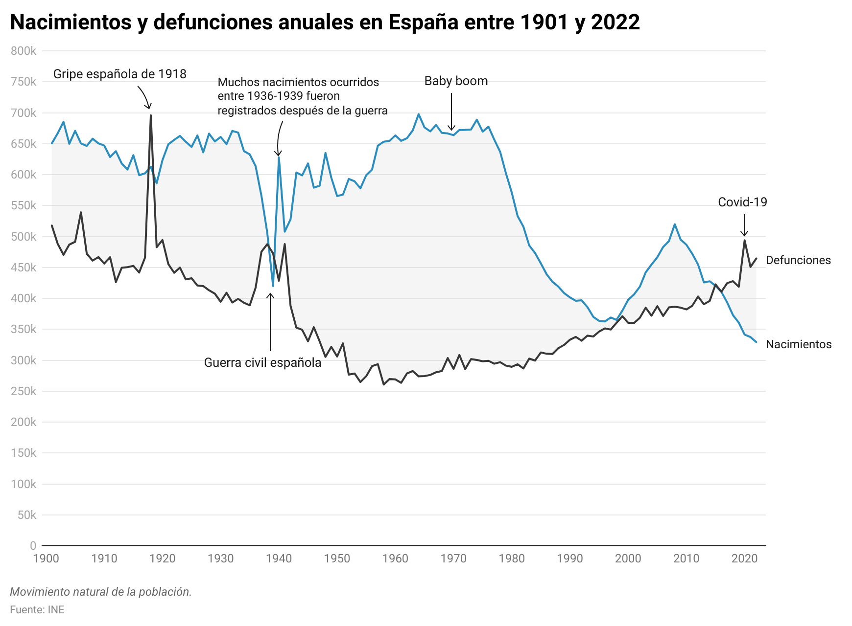 En este gráfico, puedes ver la evolución de los nacimientos y defunciones anuales entre 1901 y 2022. Es importante tener en cuenta que, durante la Guerra Civil Española, los datos no se recopilaron de manera completa, y hubo muchos nacimientos y defunciones ocurridos durante la guerra que fueron registrados años después de su finalización.