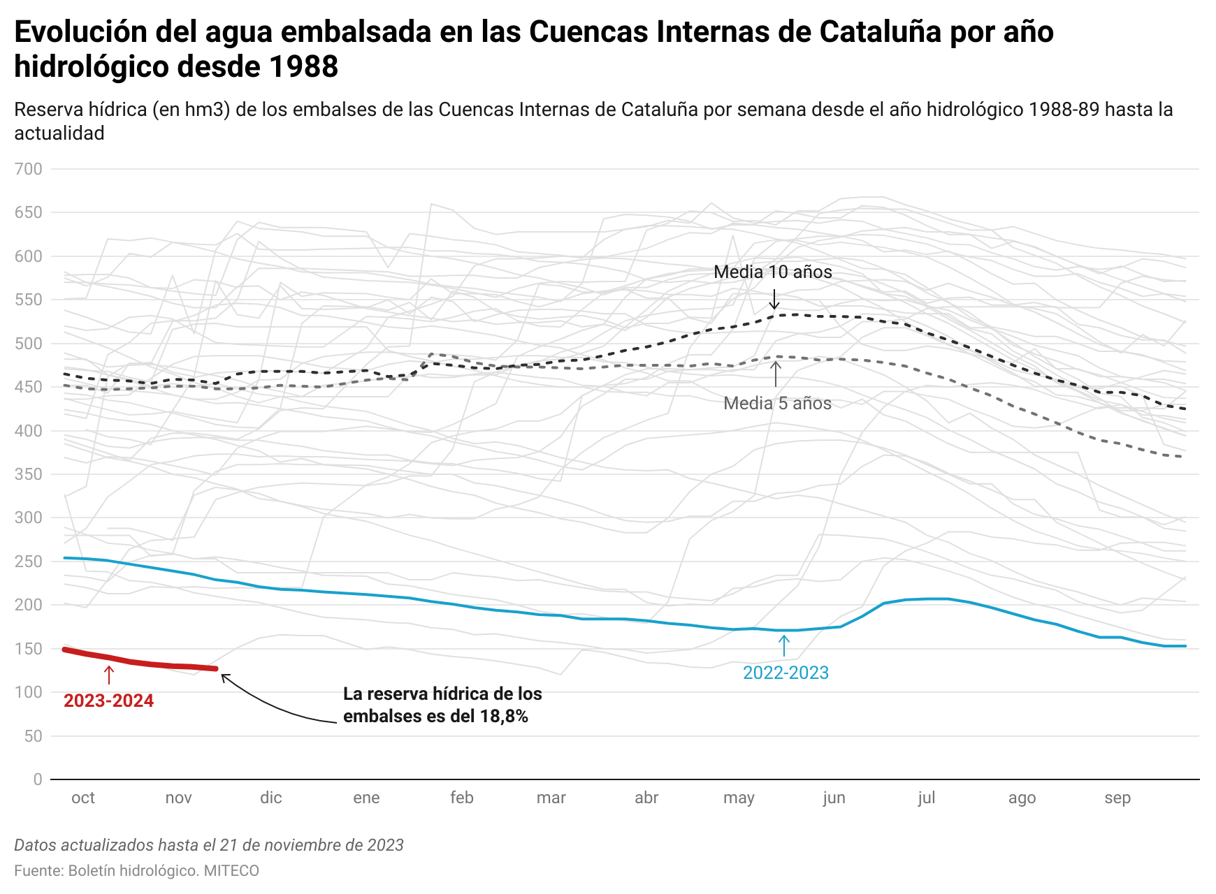 Las cuencas hidrográficas internas de Cataluña llevan ocho meses en la fase de excepcionalidad por la sequía. Según la AEMET, es la peor sequía en Cataluña desde que se tienen registros. En los últimos 36 meses, deberían haber caído unos 1.900 litros por metro cuadrado, pero solo han caído 1.400 litros. Es decir, hay un déficit de 500 litros por metro cuadrado. Desde agosto, la precipitación media acumulada es casi un 50% inferior a lo normal.
