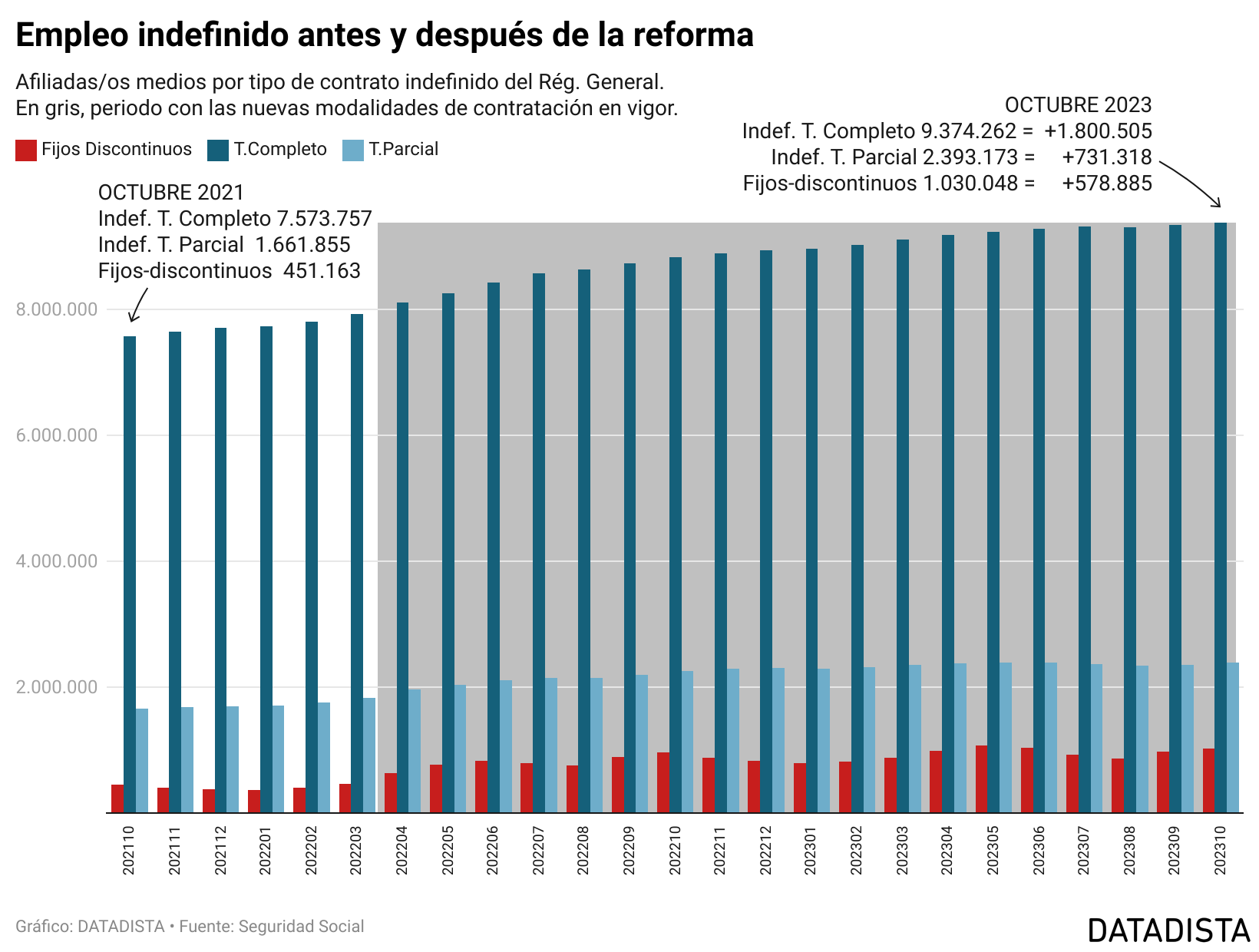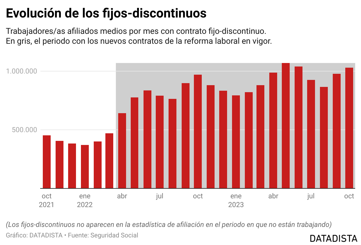 En el reino de la temporalidad, el país que guarda los empleos de invierno cuando llega el verano y viceversa, aquello era un cambio de enorme calado. Desde las primeras estadísticas mensuales tras la entrada en vigor de la reforma, la cifra de contratos indefinidos firmados mensualmente se disparó. Las voces más críticas con el Gobierno no tardaron en señalar una causa que, aseguraron y aseguran, está dopando los resultados: los contratos fijos-discontinuos. Esta modalidad ya existía antes de la última reforma laboral, tampoco ha cambiado la forma de contabilizarse pero sí es cierto que ahora vive una época de uso mucho mayor, tal y como pretendía la propia reforma, que defiende las ventajas de que el trabajador o trabajadora permanezcan vinculados a la empresa en los periodos de inactividad y, por tanto, con su contrato en vigor.
