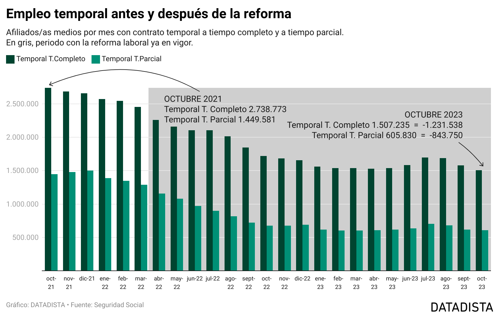 ¿Qué ha pasado en el mismo periodo con los contratos temporales? Aunque seguimos en ese país que crea empleo los lunes, lo destruye los viernes, parece subido a una ola de crecimiento el día uno y caer en depresión el último día de cada mes, si se mira la media mensual, los contratos temporales han reducido considerablemente su peso. En concreto, los temporales a tiempo completo eran el pasado mes de octubre 1.231.538 menos que en el mismo mes antes de la entrada en vigor de la reforma laboral y los temporales a tiempo parcial, 843.750 menos. Las cifras muestran que el cambio de temporal a fijo no se ha ido, ni mucho menos, masivamente a los fijos discontinuos.