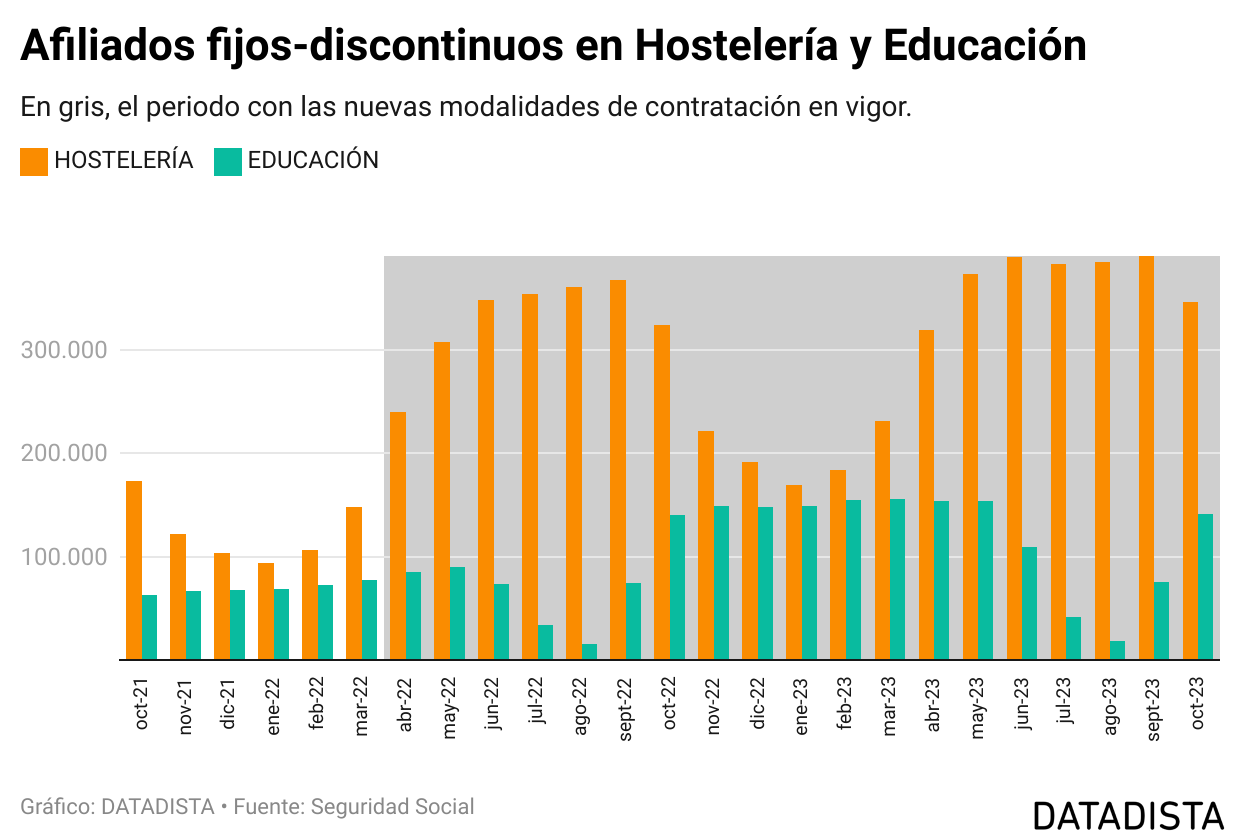 Y por último, te traemos un poco más de claridad a la famosa polémica sobre los fijos discontinuos, que podría haberse acabado con mirar la estadística adecuada pero, ya sabes, haz ruido que algo queda. Lo importante es ver cómo ha impactado este tipo de contratación en los afiliados, cuánto pesa en el total de indefinidos y qué sectores están haciendo un uso más intensivo. Spoiler: la educación está registrando picos de fijos discontinuos en actividad que van desde los 156.000 afiliados y afiliadas con contrato fijo discontinuo en marzo de este año a 18.100 en agosto. ¿Son realmente fijos discontinuos todos o deberían estar contratados como indefinidos ordinarios y disfrutar de vacaciones remuneradas?