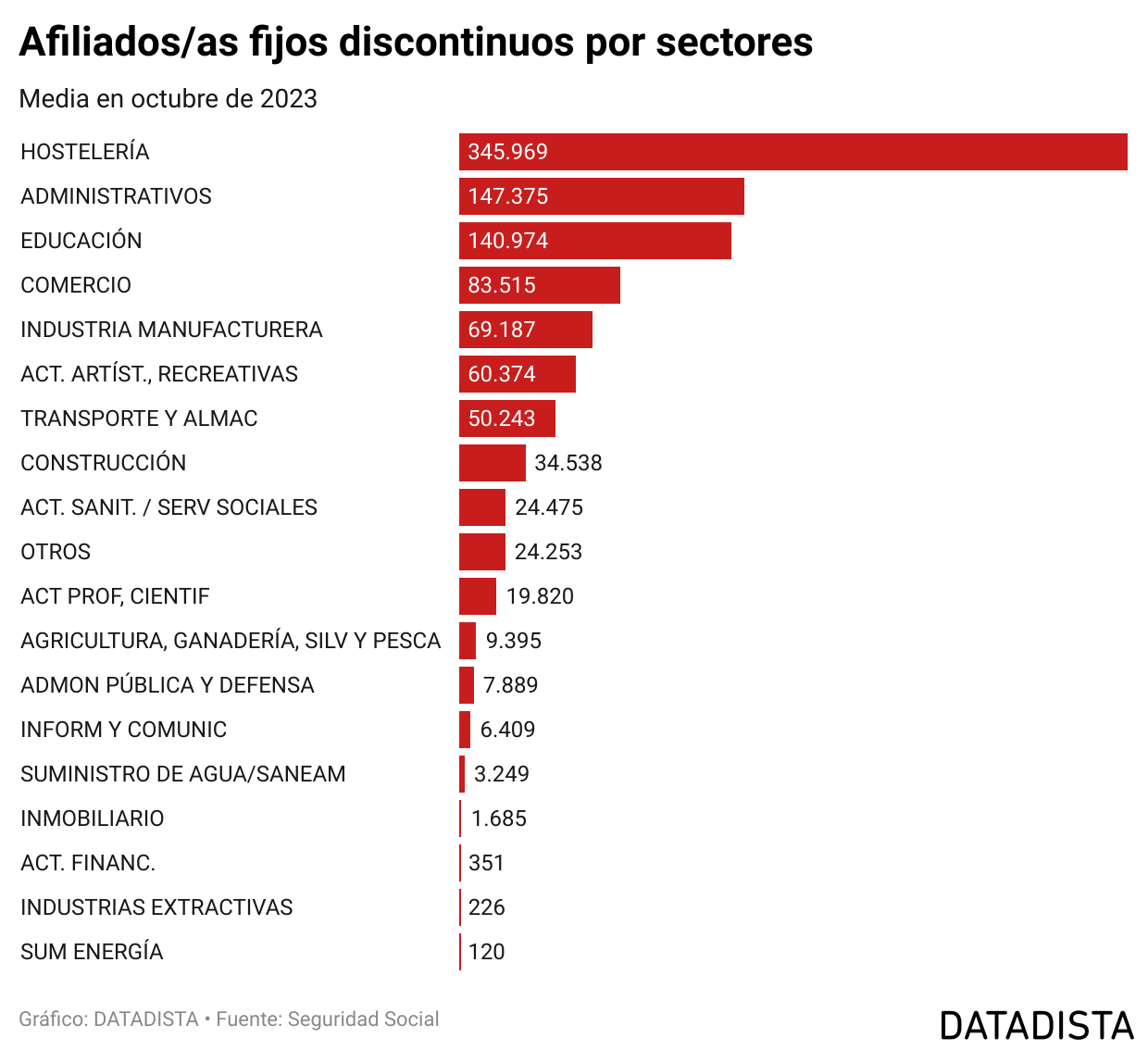 Los sectores de la hostelería y la educación están, como se ha comentado, entre los que más trabajadores y trabajadoras con contrato fijo discontinuo generan pero en algunos meses se ha colado en segunda posición el sector de los trabajos administrativos. Entre los diez primeros sectores están además el comercio, la industria manufacturera, las actividades artísticas y recreativas, el transporte y almacenamiento, la construcción, así como las actividades sanitarias y de servicios sociales. Esta foto cambia radicalmente entre unas épocas y otras pero sobre todo lo hace por dos sectores que son los que presentan los cambios más bruscos a lo largo del año: hostelería y educación.