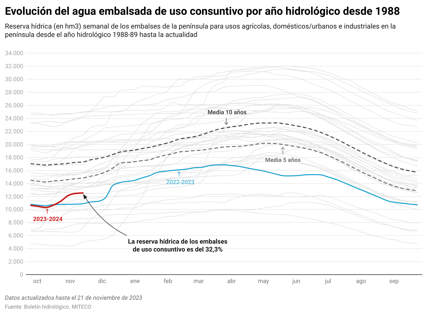 La reserva de agua actual de los embalses para uso consuntivo de la Península es de 12.540 hm³, lo que representa el 32,3% de la capacidad total embalsada. Este aumento se debe a las precipitaciones que se produjeron en buena parte del país en octubre. En la última semana, el agua embalsada ha aumentado en 66 hm³ (el 0,2 % de la capacidad total de los embalses), con variaciones que van desde -7 hm³ en la Cuenca del Segura hasta +51 hm³ en la del Duero.