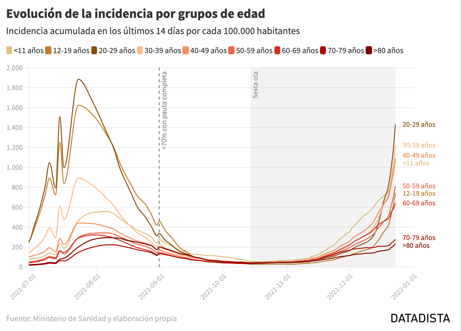 Las primeras semanas de la sexta ola, los niños menores de 11 años eran el grupo de edad con mayor incidencia. Sin embargo, en los últimos días las personas entre 20 y 49 años se han situado con una mayor incidencia.
