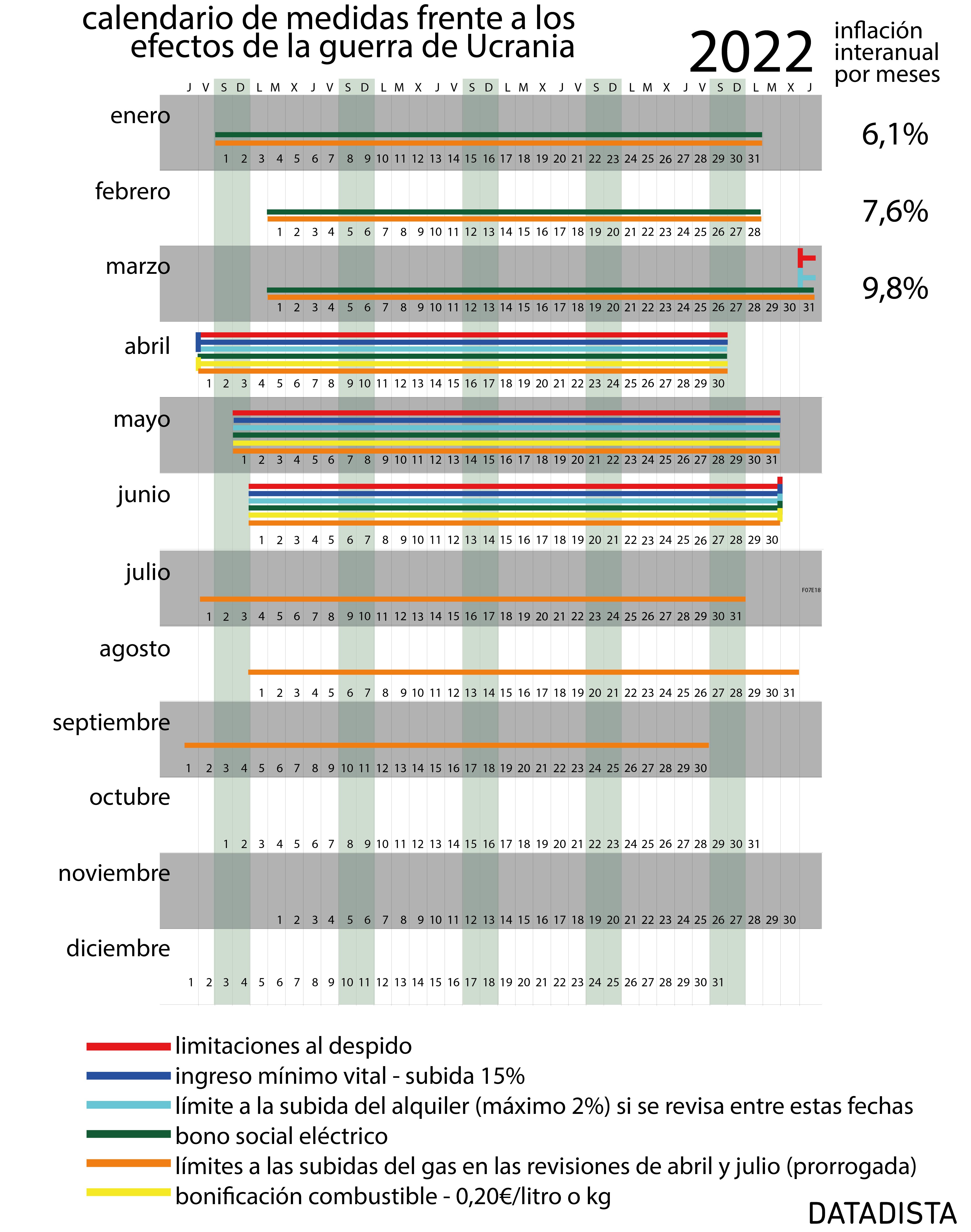 Y como se nos superponen las crisis y los acontecimientos históricos, mientras unas medidas van quedando para el recuerdo, otras, las derivadas de la guerra en Ucrania, ya están plagando el Boletín Oficial del Estado. Hemos elaborado un calendario, que iremos actualizando, para que puedas saber de un vistazo cuándo entra en vigor cada una de esas medidas y hasta cuándo está previsto mantenerlas. Son tantas que hasta al Gobierno se le han colado en las 160 páginas del Real Decreto Ley temas que no tenían nada que ver con esta nueva crisis. El arte de legislar tiene conocidos remiendos, pero colar el accidente nuclear de Palomares de hace 56 años lleva camino de integrar la lista de los más llamativos.