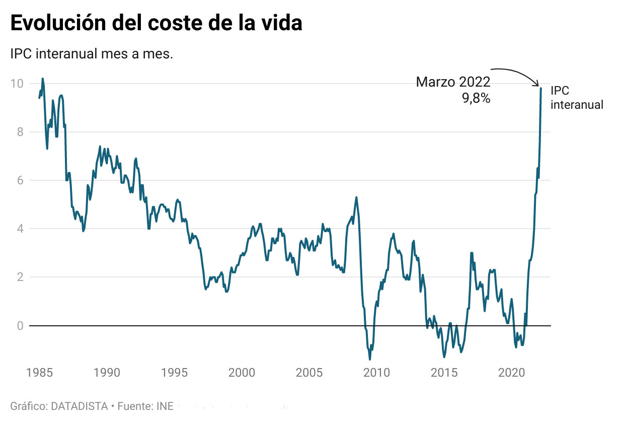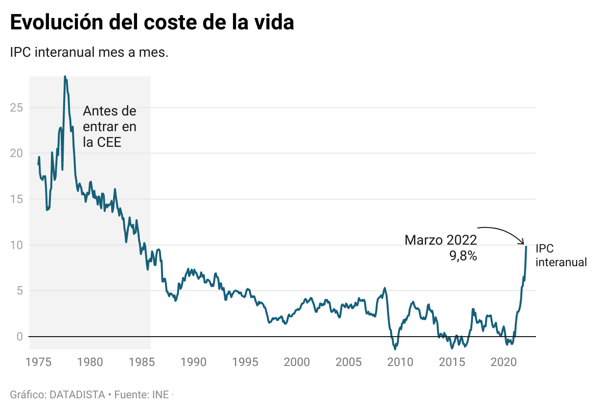 Por el camino, la inflación interanual de marzo en España, el incremento del coste de la vida con respecto al mismo mes de 2021, ha escalado ya hasta el 9,8%, según el indicador adelantado del INE. No se veía nada igual desde mayo de 1985 y no es un año cualquiera. Habrás visto un gráfico similar a este en los medios por activa y por pasiva. Lo que no se ha visto tanto es otro que te mostramos más abajo y que habla de la historia de España.
