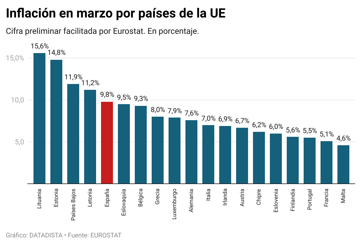Se podría hablar mucho del aplanamiento de aquella curva, la crisis energética de los años setenta, las devaluaciones de la peseta, el camino de la disciplina monetaria, el euro y sus bondades, a pesar del efecto del canje en el fuerte repunte de precios de consumo que tuvo en países como España... El hecho es que ahora la inflación está poniendo a prueba los mimbres de la Unión Europea desde el bolsillo de sus ciudadanos. Todos los países europeos sufren con el encarecimiento del coste de la vida, con la media situada en marzo ya en el 7,5%, pero unos están sufriendo más que otros y, entre los que más, se encuentra España.