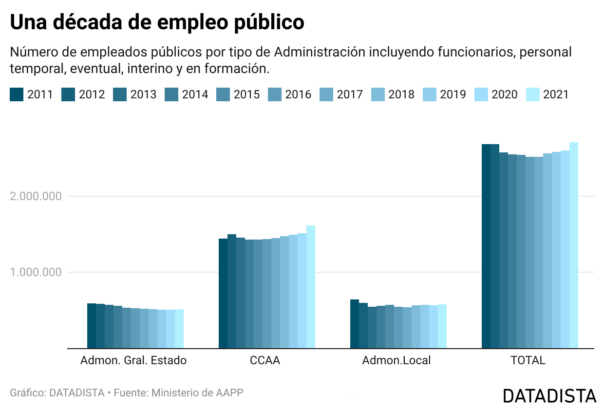 Según el Boletín Estadístico del Personal al Servicio de las AAPP, a comienzos de 2021 había 2.710.405 personas trabajando al servicio de la Administración en alguno de sus tres niveles: estatal, autonómico y local. El punto más bajo a lo largo de la crisis se tocó en 2016, cuando la cifra total fue de 2.519.280 trabajadoras/es. Es decir, 166.557 menos que cuando Rajoy fue investido presidente por primera vez. El empleo público no solo ha recuperado los niveles de finales de 2011 sino que los ha superado ya. Cómo está repartido actualmente.