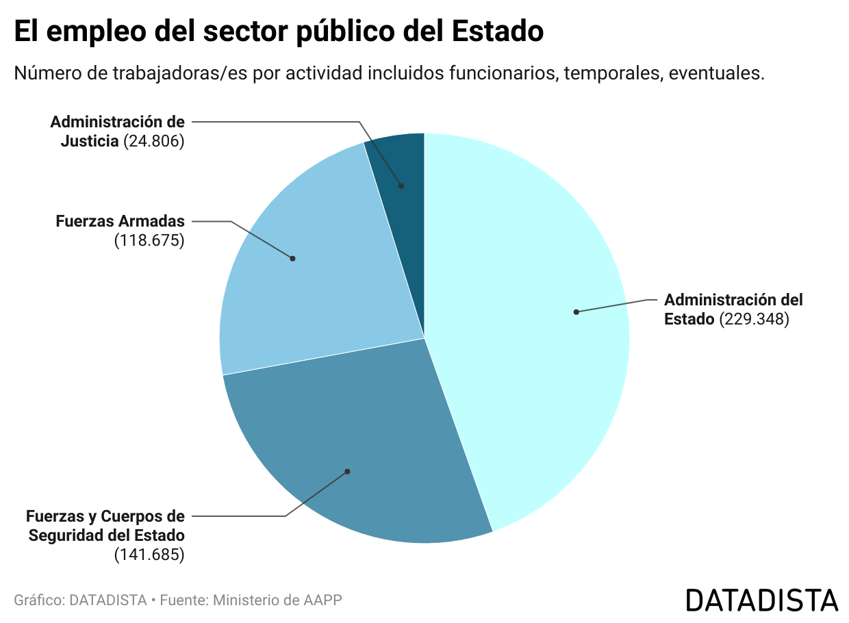 El sector público del Estado, que emplea a 229.348 personas, está integrado, además de por la Administración del Estado en sí (ministerios, organismos autónomos, agencias estatales, autoridades administrativas independientes y universidades públicas no transferidas a las comunidades autónomas), por las Fuerzas Armadas, los Cuerpos y Fuerzas de Seguridad y la Administración de Justicia.