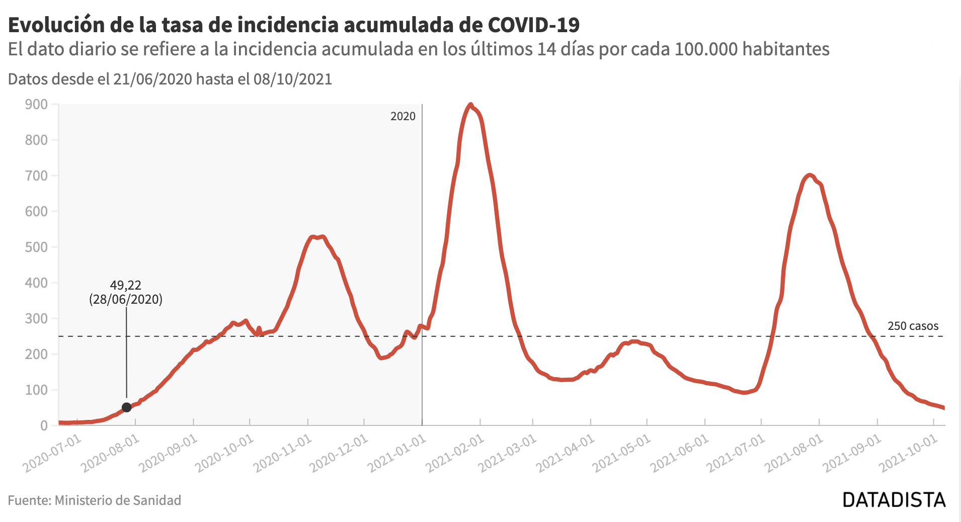 España ha entrado esta semana en nivel bajo de riesgo por covid al bajar la incidencia acumulada de los 50 casos por cada 100.000 habitantes en los últimos 14 días. El viernes era de 48,18 casos. Esta situación no se daba desde el 28 de julio de 2020. Melilla, Cantabria, Cataluña, Aragón, Baleares, Ceuta, País Vasco y Madrid se encuentran por encima pero ninguna comunidad autónoma supera los 100 casos de incidencia.