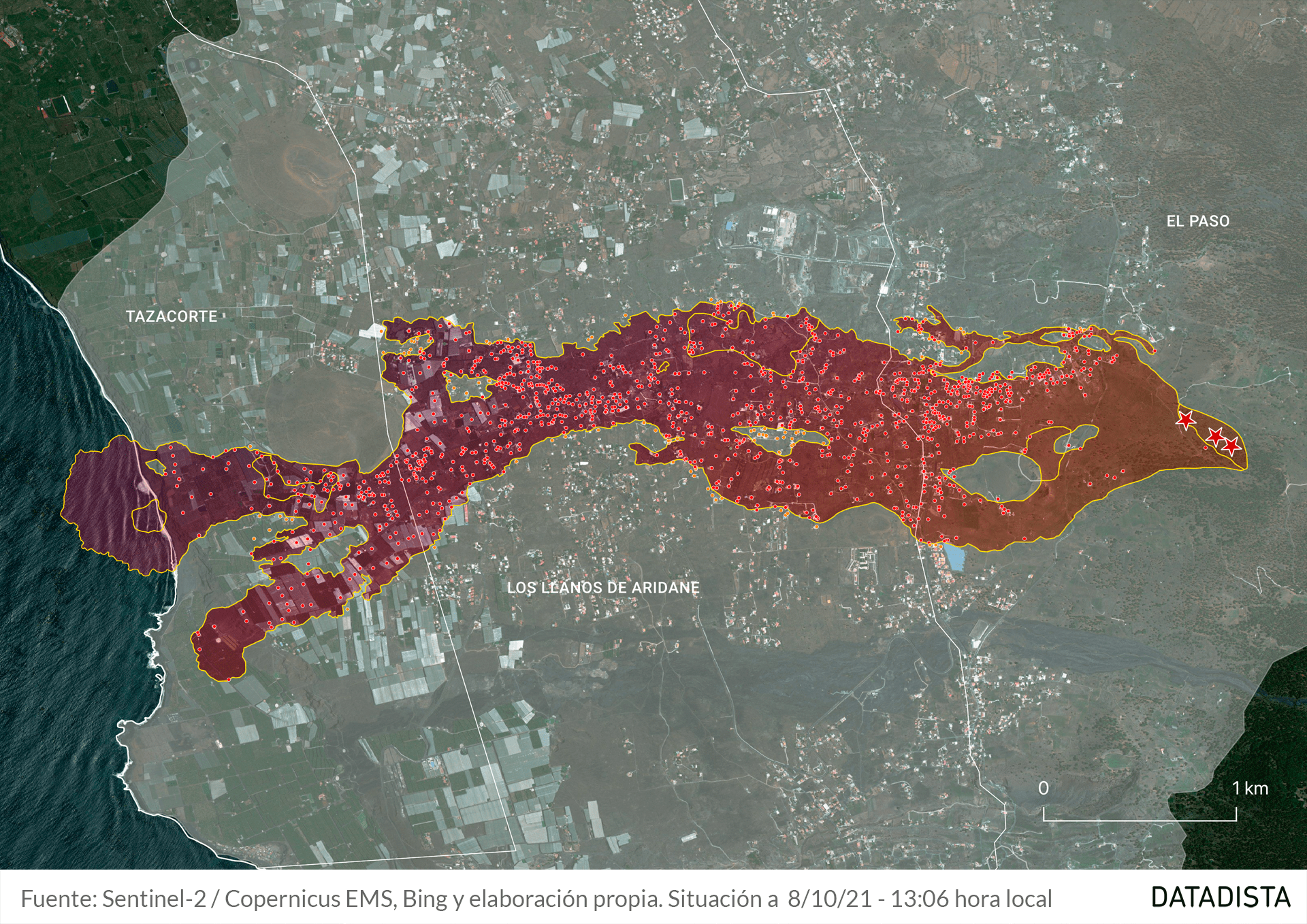 Hoy se cumplen tres semanas de la primera erupción del volcán de La Palma. Según la última actualización de datos realizada por el Servicio de Gestión de Emergencias de Copernicus, hasta el mediodía del 8 de octubre, la colada de lava ocupa 497 hectáreas, ha destruido 1.186 edificaciones e infraestructuras y dañado 95. La fajana creada en la costa alcanza ya las 32 hectáreas. La superficie ocupada por la ceniza volcánica superar las 5.500 hectáreas.