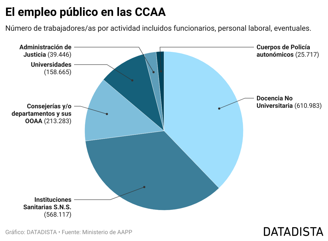 Como puedes ver en el gráfico, la mayor parte del empleo público está en las comunidades autónomas. Y la explicación está en que son las que ostenta las competencias de sanidad y educación, dos ámbitos además que vieron fuertemente reforzadas sus plantillas debido a la COVID-19.