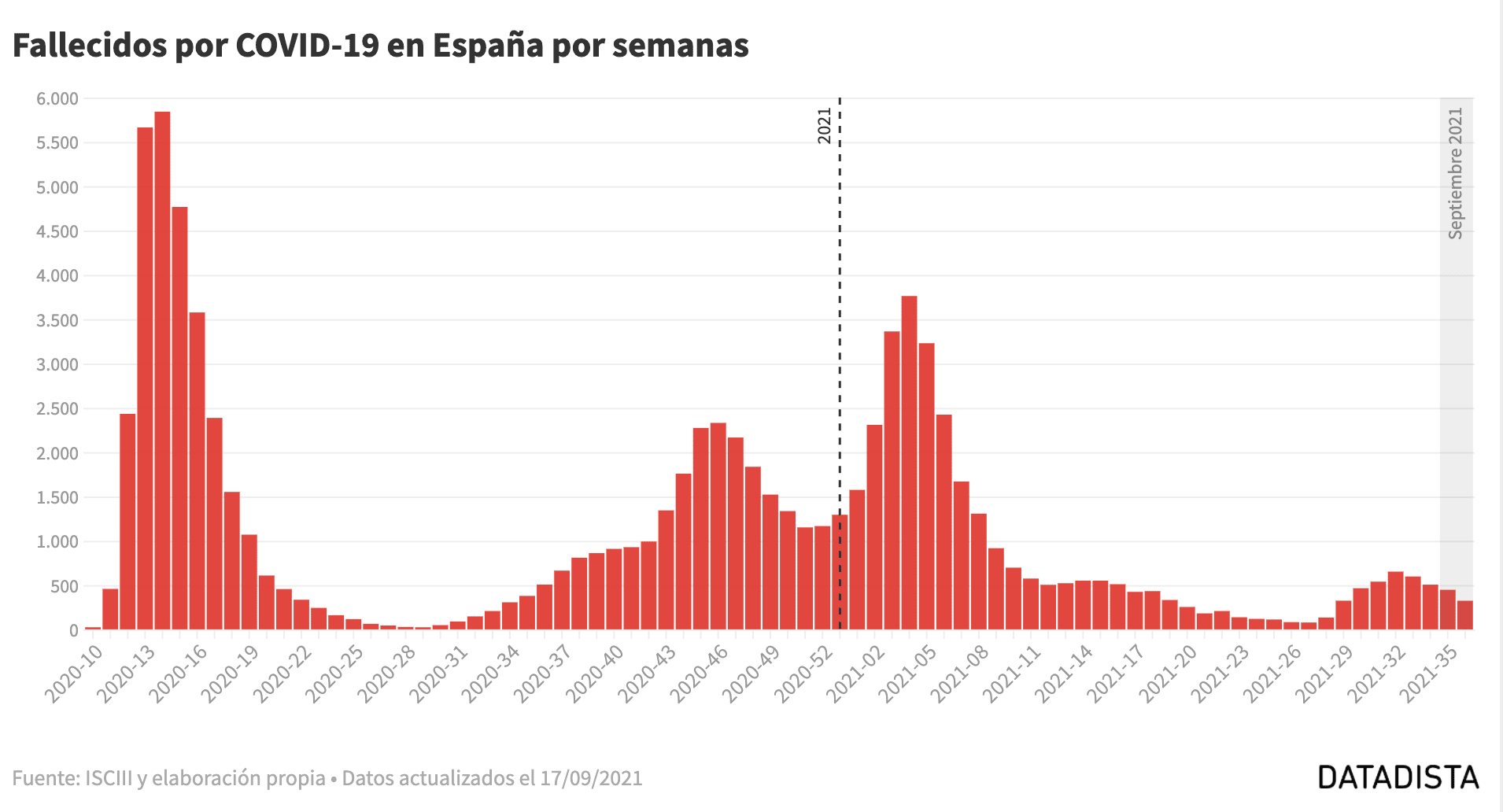 También están bajando el número de fallecidos desde hace un mes. Este gráfico mostramos el número de fallecidos semanales hasta la semana pasada, a falta de consolidación de la serie en los próximos días.