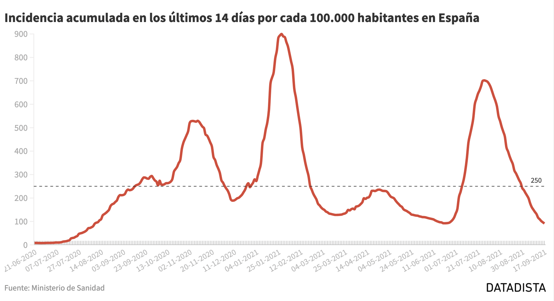 La quinta ola continúa en descenso y ha alcanzado 91,21 casos de incidencia acumulada en los últimos 14 días por cada 100.000 habitantes. No teníamos un nivel tan bajo desde el verano de 2020 aunque a finales de junio de este año la incidencia también se situó por debajo de los 100 casos por cada 100.000 habitantes durante 8 días. Luego comenzó a subir rápidamente para convertirse en la quinta ola. En este gráfico puedes ver la evolución desde junio de 2020.