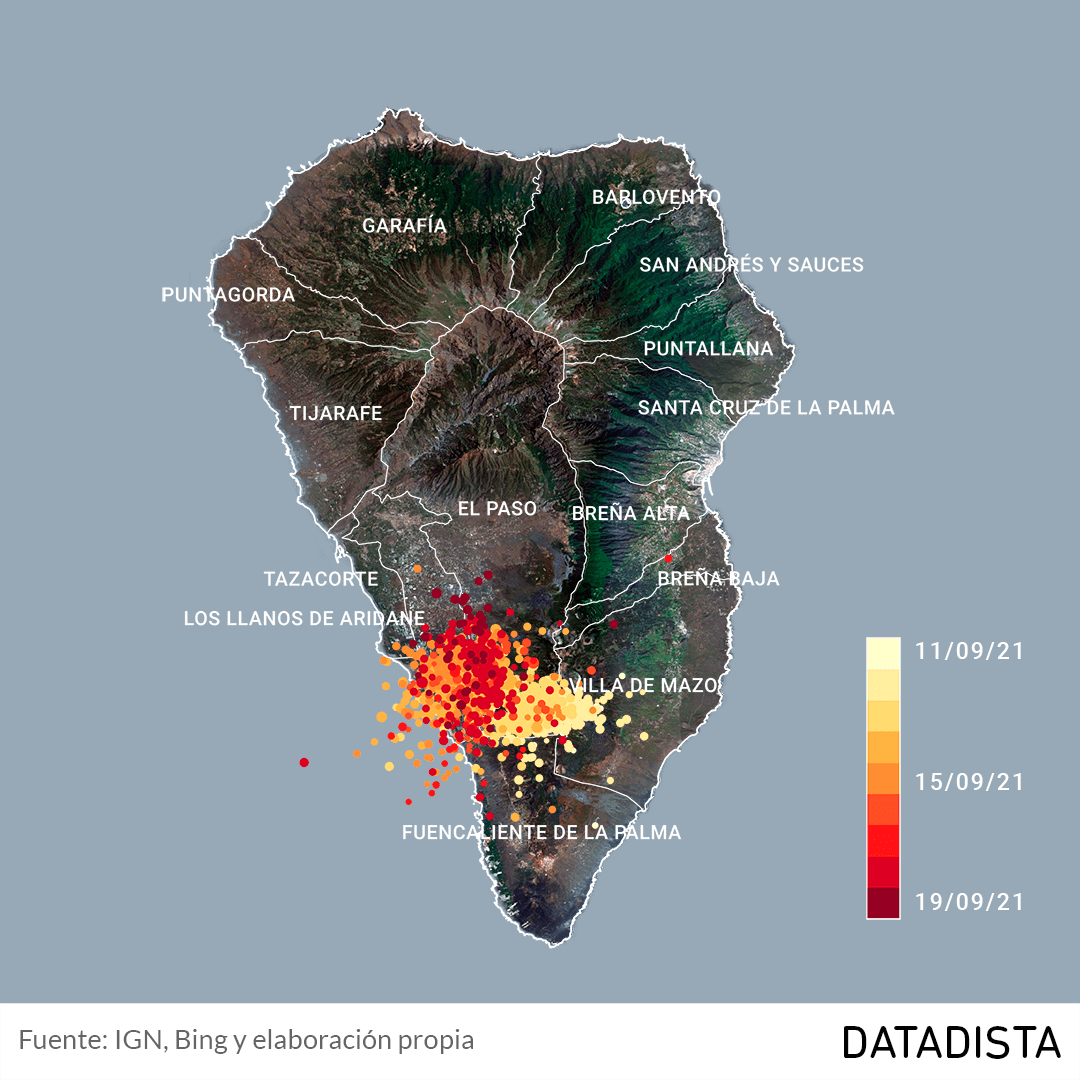 Desde el 11 de septiembre se ha producido un aumento de la actividad sísmica en el sur de la isla de La Palma en Canarias. Se han detectado más de 5.400 terremotos, de los cuales 1.286 han sido localizados. Los puedes ver en la siguiente infografía que hemos realizado. El color del terremoto es según el día que se ha producido y su tamaño va en función de su intensidad.