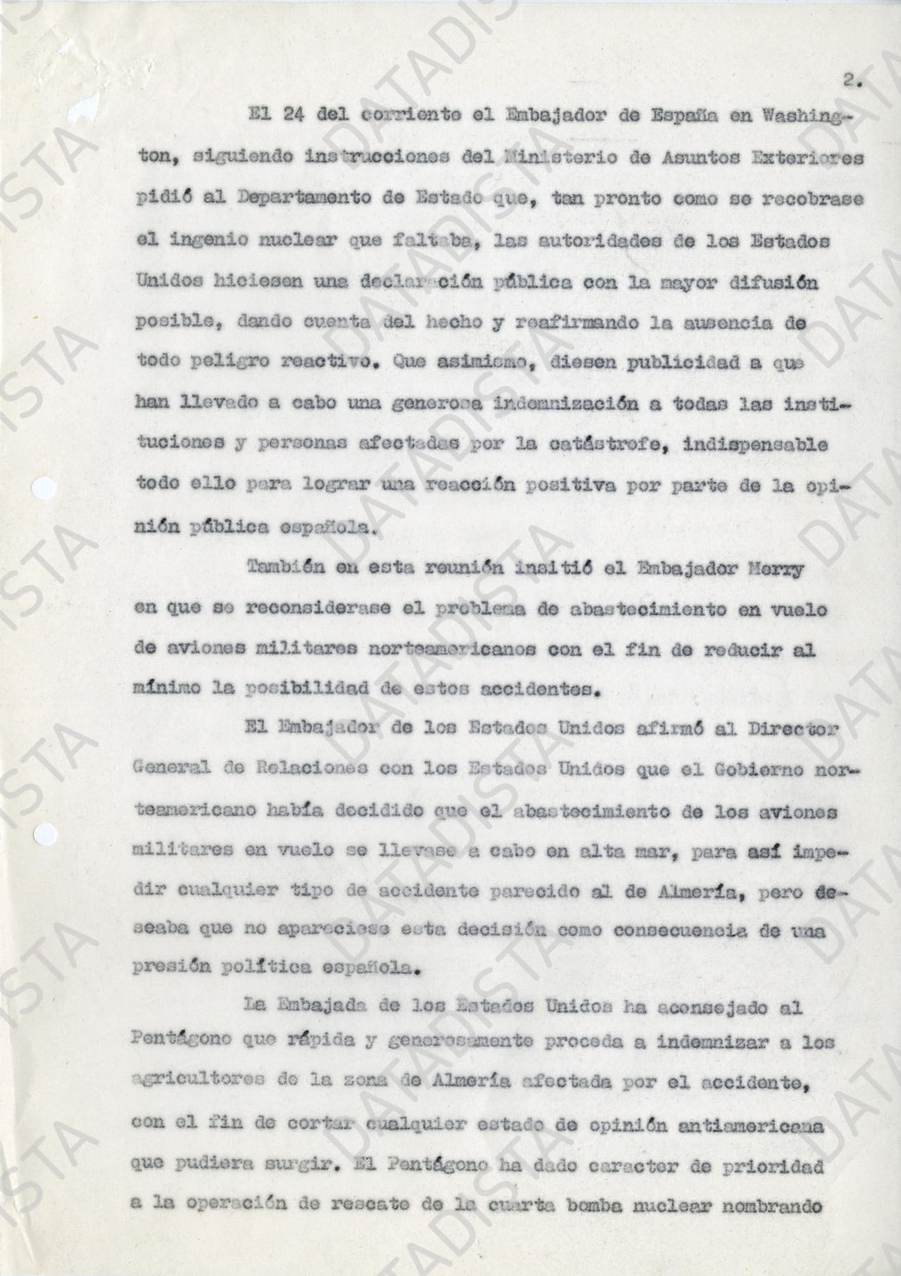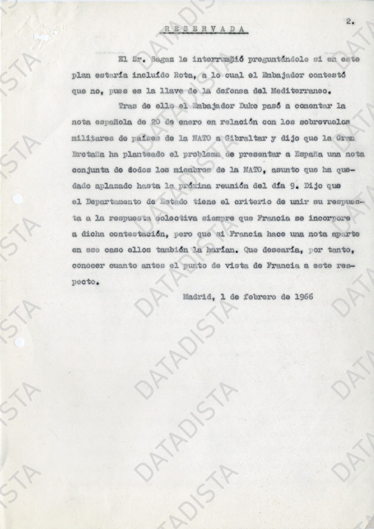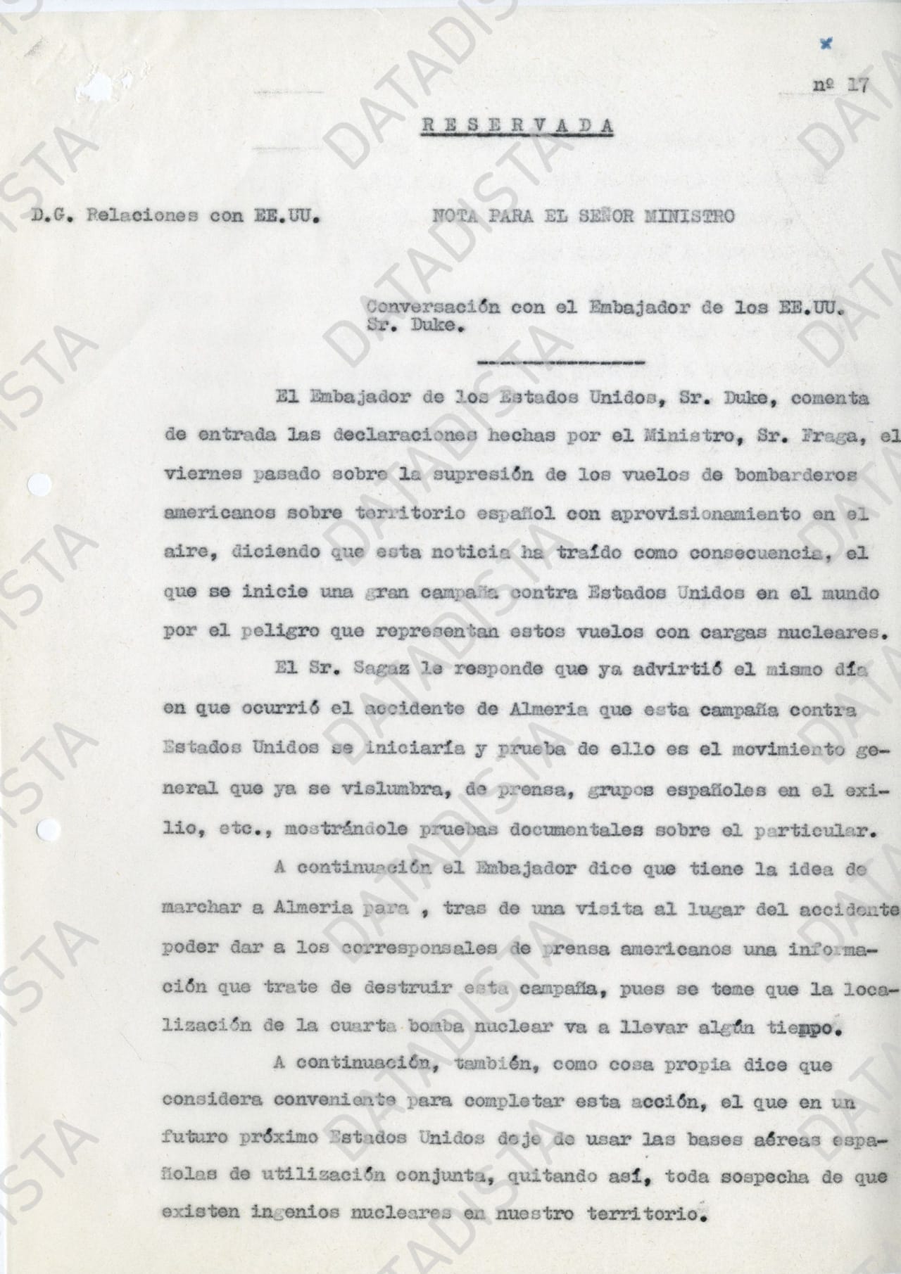 El ministro de Asuntos Exteriores recibe diferentes notas que se conservan que le van dando información de lo que va ocurriendo en diferentes reuniones en las que se trata el accidente de Palomares. En varias de esas notas, como una fechada el 1 de febrero de 1966, se cita una conversación en la que se habló de que EEUU había decidido por sí mismo dejar de repostar sobre población civil para hacerlo en alta mar. Es una pretendida generosidad que quiere frenar los tímidos conatos que llegan desde el Gobierno de Franco de revisar su acuerdo. Se saca a colación en una reunión entre el embajador de EEUU, Angier Biddle Duke (el del famoso baño con Fraga), y el director general de Relaciones con los EEUU del Ministerio de Asuntos Exteriores español, Ángel Sagaz. El primero se pasa de frenada y comenta como posibilidad que "en un futuro próximo EEUU deje de usar las bases aéreas españolas de utilización conjunta, quitando así, toda sospecha de que existen ingenios nucleares en nuestro territorio". Sagaz "le interrumpió preguntándole si en este plan estaría incluido Rota, a lo cual el Embajador contestó que no, pues es la llave de la defensa del Mediterráneo", recoge la nota.