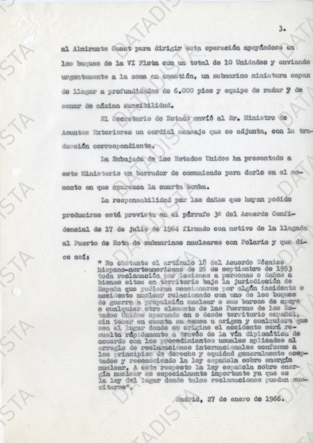 "La responsabilidad por los daños que hayan podido producirse está prevista en el párrafo 3º del Acuerdo Confidencial de 17 de julio de 1964 firmado con motivo de la llegada al Puerto de Rota de submarinos nucleares con Polaris y que dice así: (...) toda reclamación por lesiones a personas o daños a bienes sitos en territorio bajo la jurisdicción de España que pudieran ocasionarse por algún incidente o accidente nuclear relacionado con uno de los buques de guerra a propulsión nuclear o sus barcos de apoyo o cualquier otro elemento de las Fuerzas de los Estados Unidos operando en o desde territorio español, sin tener en cuenta su causa u origen y cualquiera que sea el lugar donde se origine el accidente será resuelta rápidamente a través de la vía diplomática (...) reconociendo la ley española sobre energía nuclear".