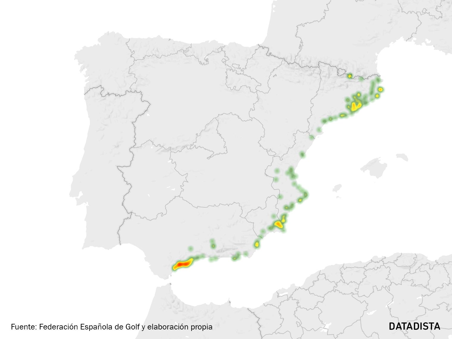 En este mapa de calor puedes ver la concentración de campos de golf en el litoral Mediterráneo. Málaga, Murcia, Alicante y Barcelona, acumulan la mayor concentración de este tipo de instalaciones.