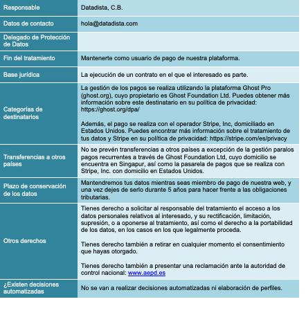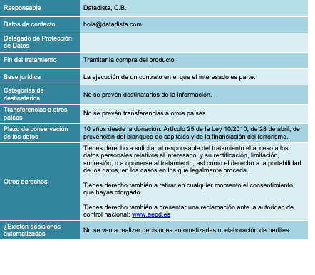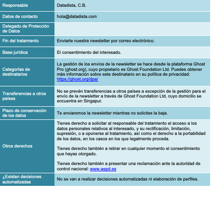 El titular de esta web es DATADISTA, C.B. (en adelante, Datadista), con NIF E88072558, con domicilio a estos efectos en Madrid, Plaza del Callao núm. 1, oficina 607 y dirección electrónica de contacto hola@datadista.com.